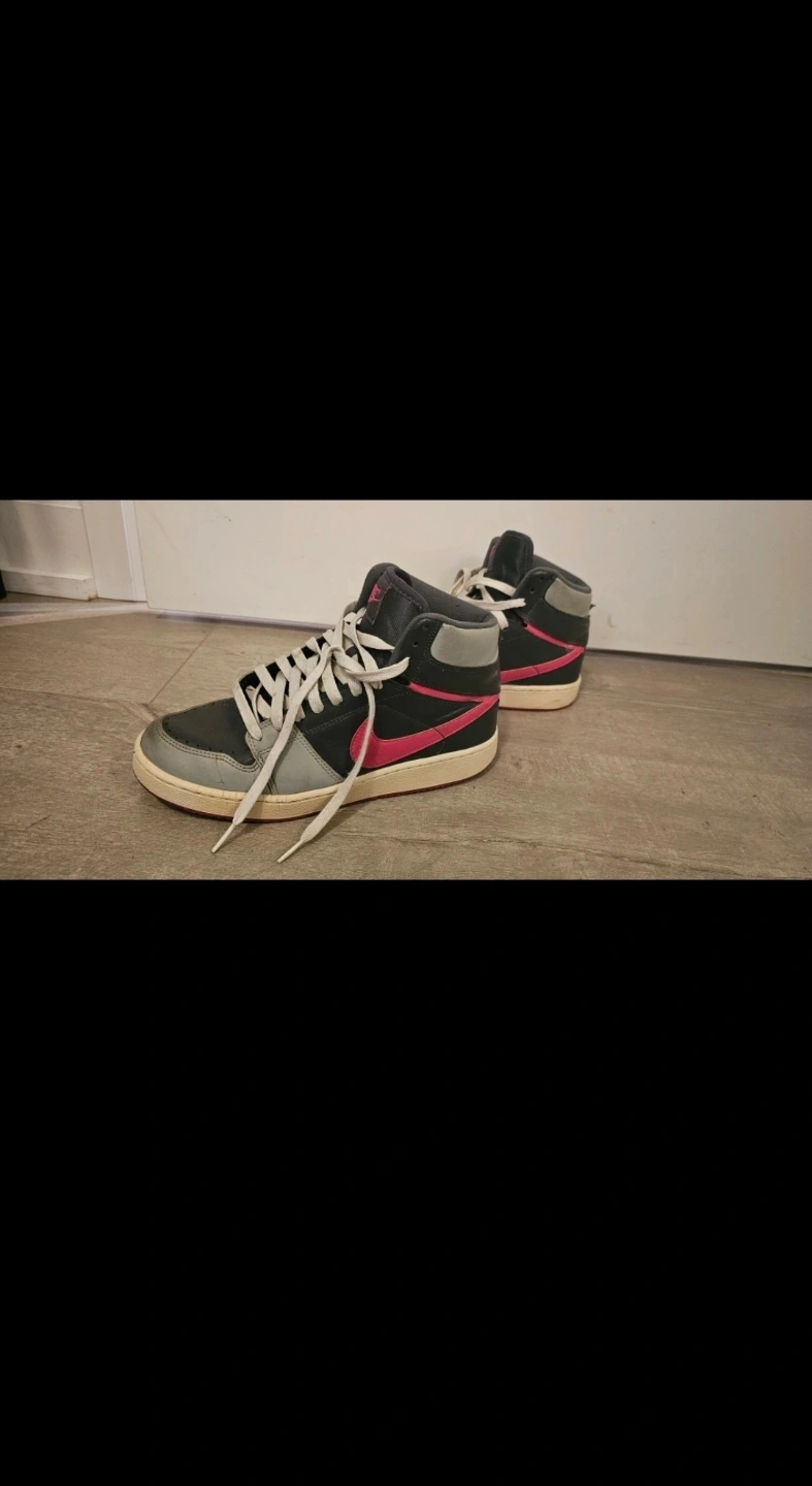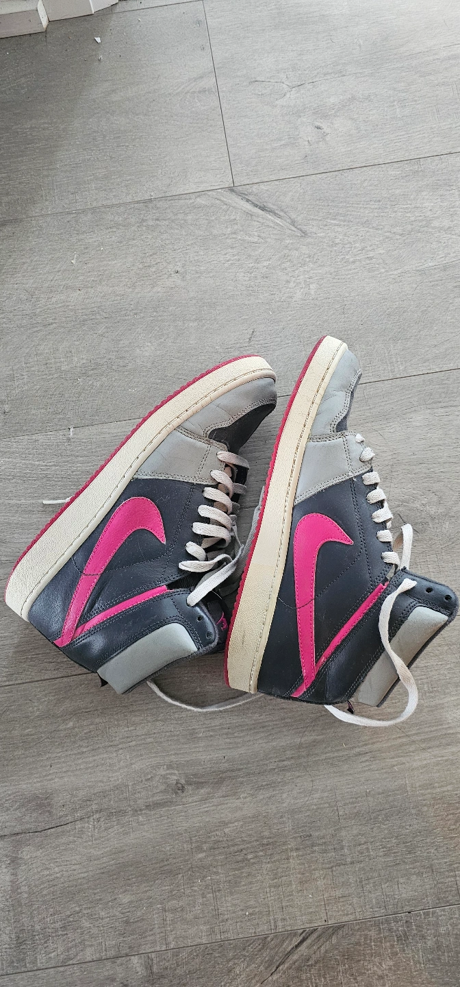 Pair of used Nike high top sneakers. Grey and black colour scheme with pink accents. Off-white soles. Lace-up closure.