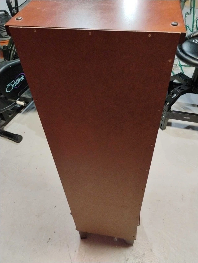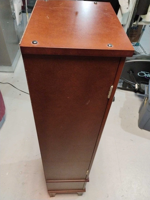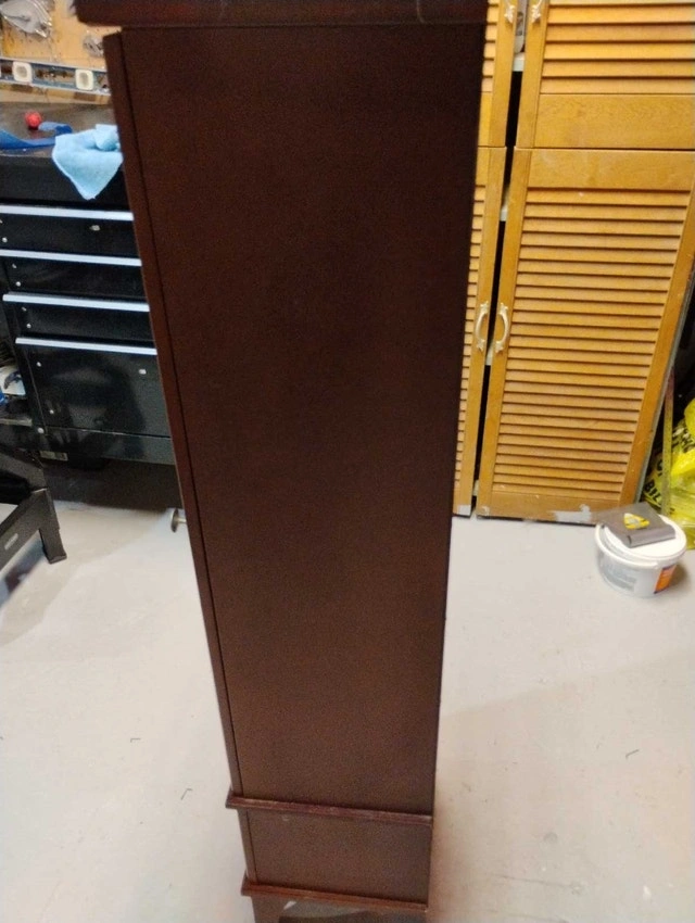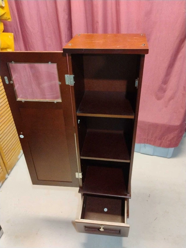 This used cabinet offers versatile storage with its enclosed shelving and convenient drawer. The rich, dark wood finish adds a touch of elegance to any room, making it a functional and stylish addition to your home decor. It is in good condition. Key features include enclosed shelving, a bottom drawer, and a dark wood finish. If you're seeing this ad, the cabinet is still available!
