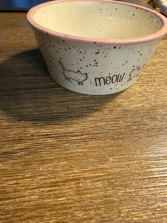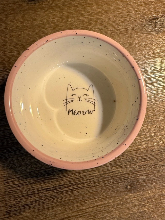 This charming ceramic cat bowl is perfect for your feline friend. Featuring adorable cat illustrations and the word 'meow', it adds a touch of whimsy to feeding time. This bowl is used but still in great condition and ready to serve your cat's meals with style. Let me know if you're interested!