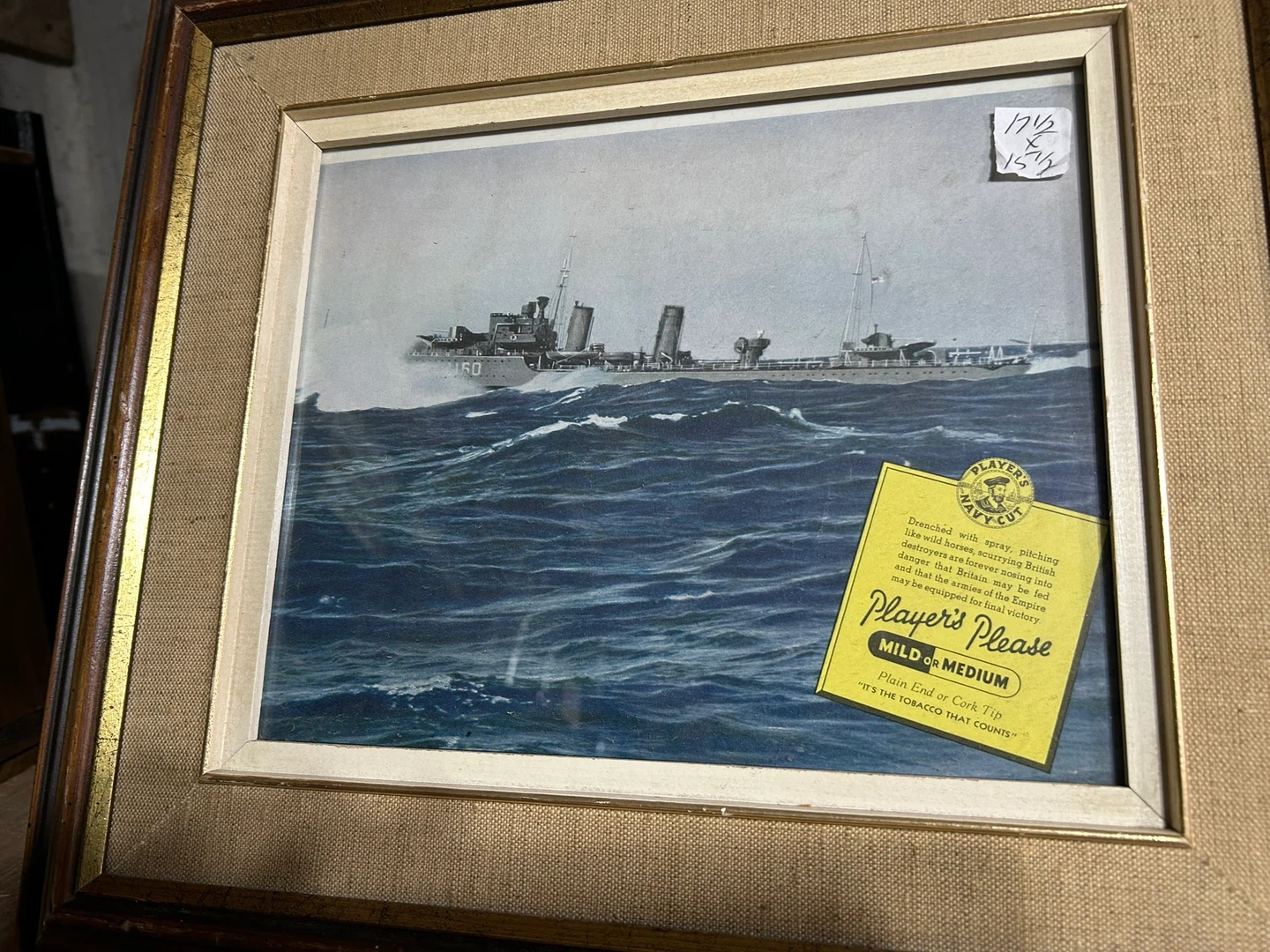 Framed print featuring a Players Navy Cut advertisement. The advertisement depicts British destroyers at sea. It measures 17 1/2 x 15 1/2 inches. This is a classic piece of tobacco advertising history.