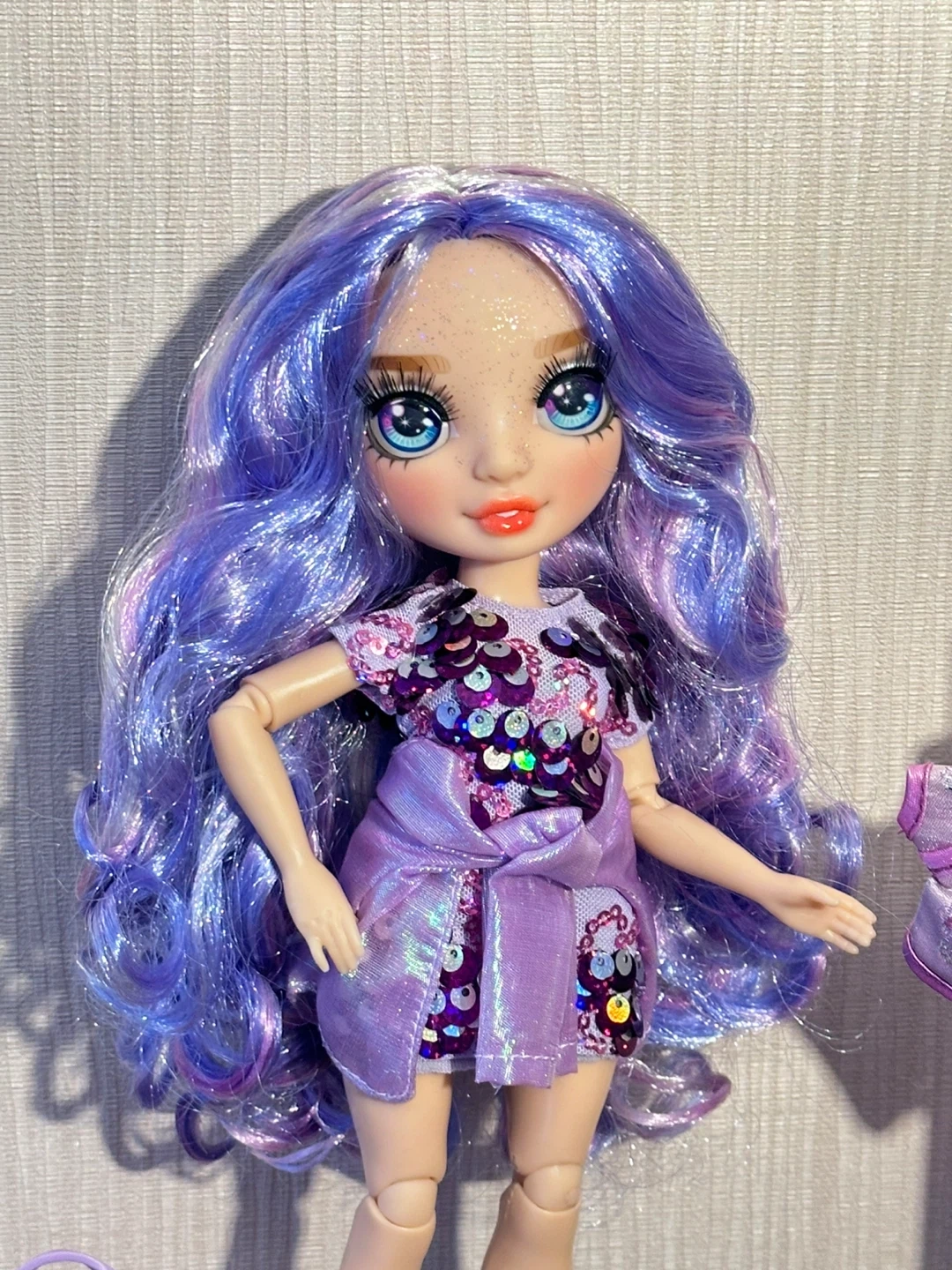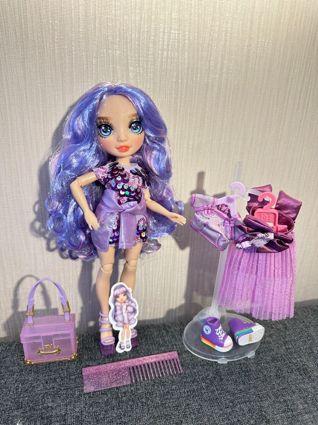 This Rainbow High doll comes with multiple outfits and accessories. It features a purple-themed wardrobe including a dress, jacket, and shoes. Also included is a doll-sized handbag and a comb.
