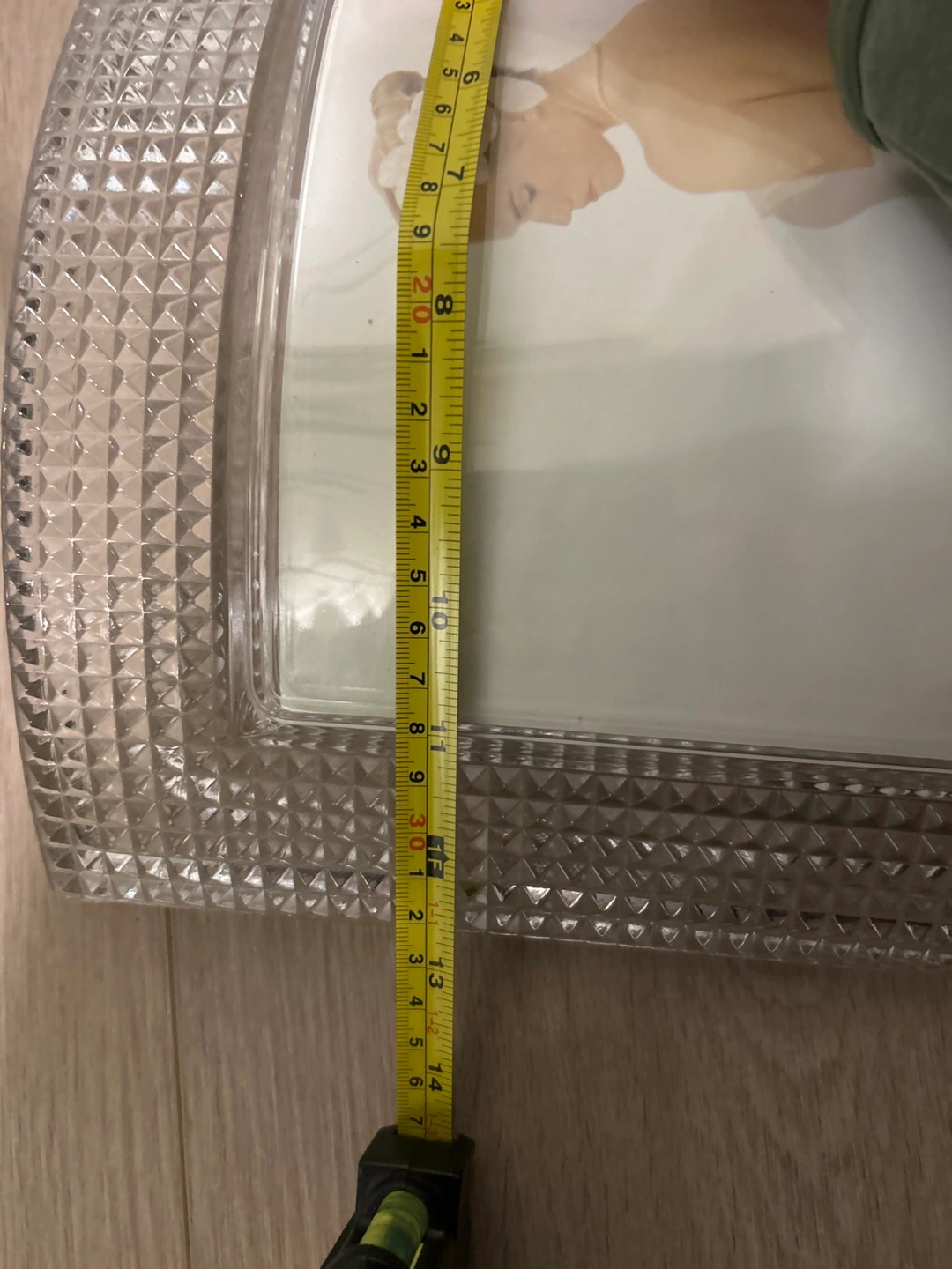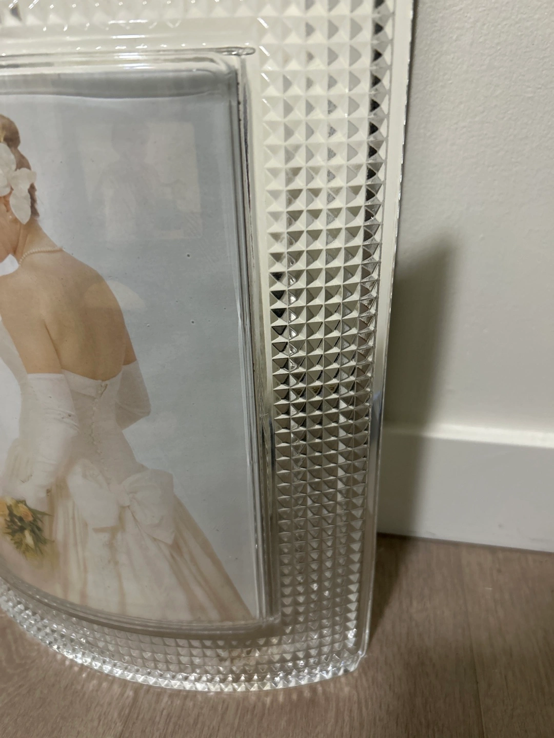 This crystal photo frame features a textured, diamond-cut border. It's designed to hold a standard photo size. The frame has a substantial, decorative look.