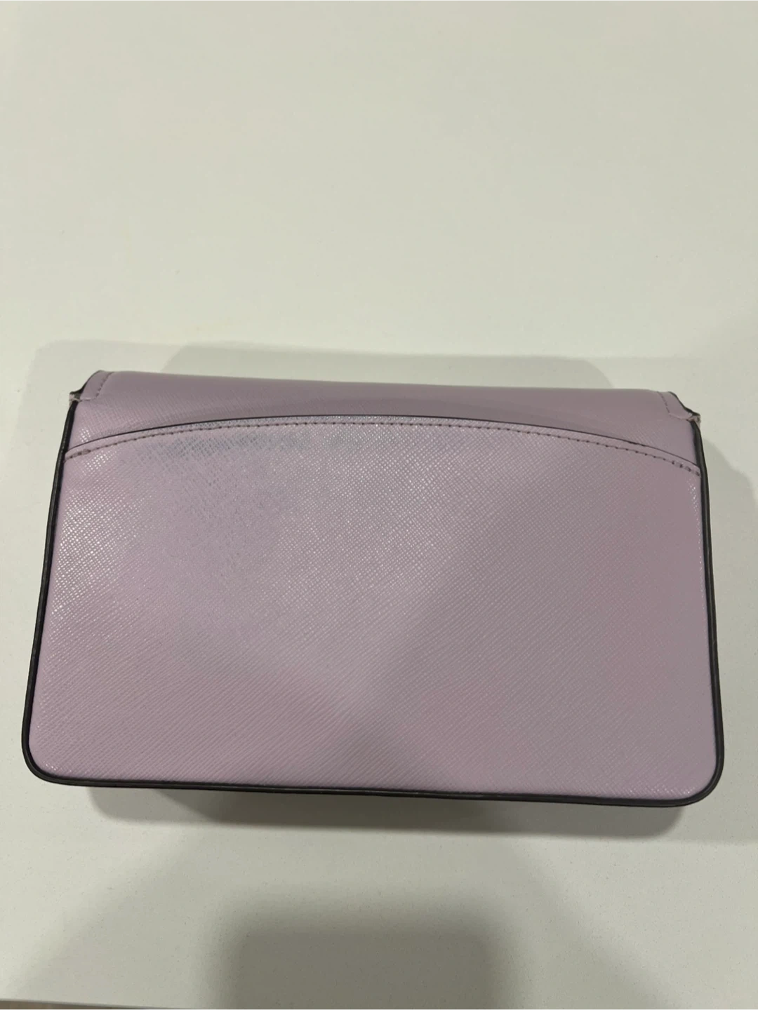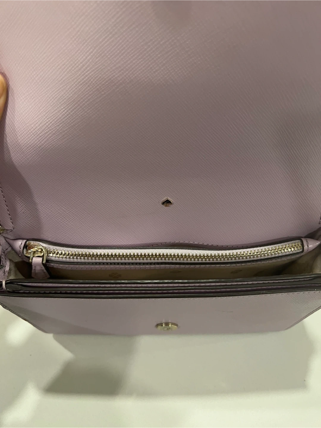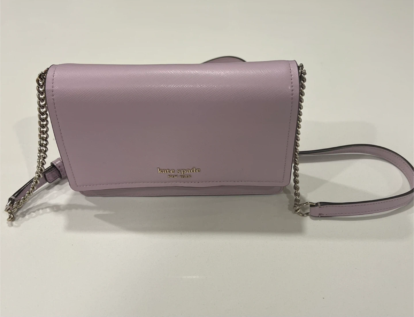 This is a Kate Spade New York shoulder bag. It's made of lavender saffiano leather. It features a silver-tone chain strap and a front flap closure with a snap button. The interior has multiple card slots and a zippered pocket. This bag is perfect for a night out or everyday use!