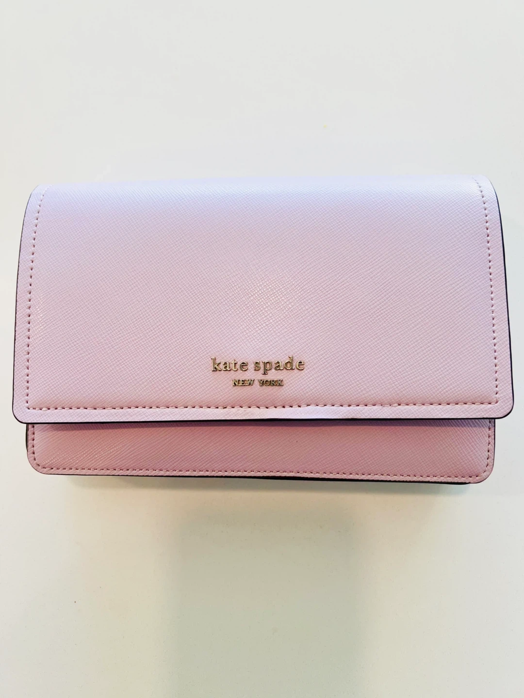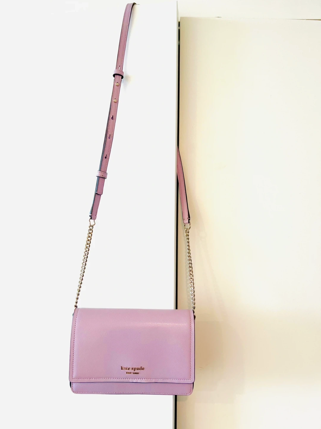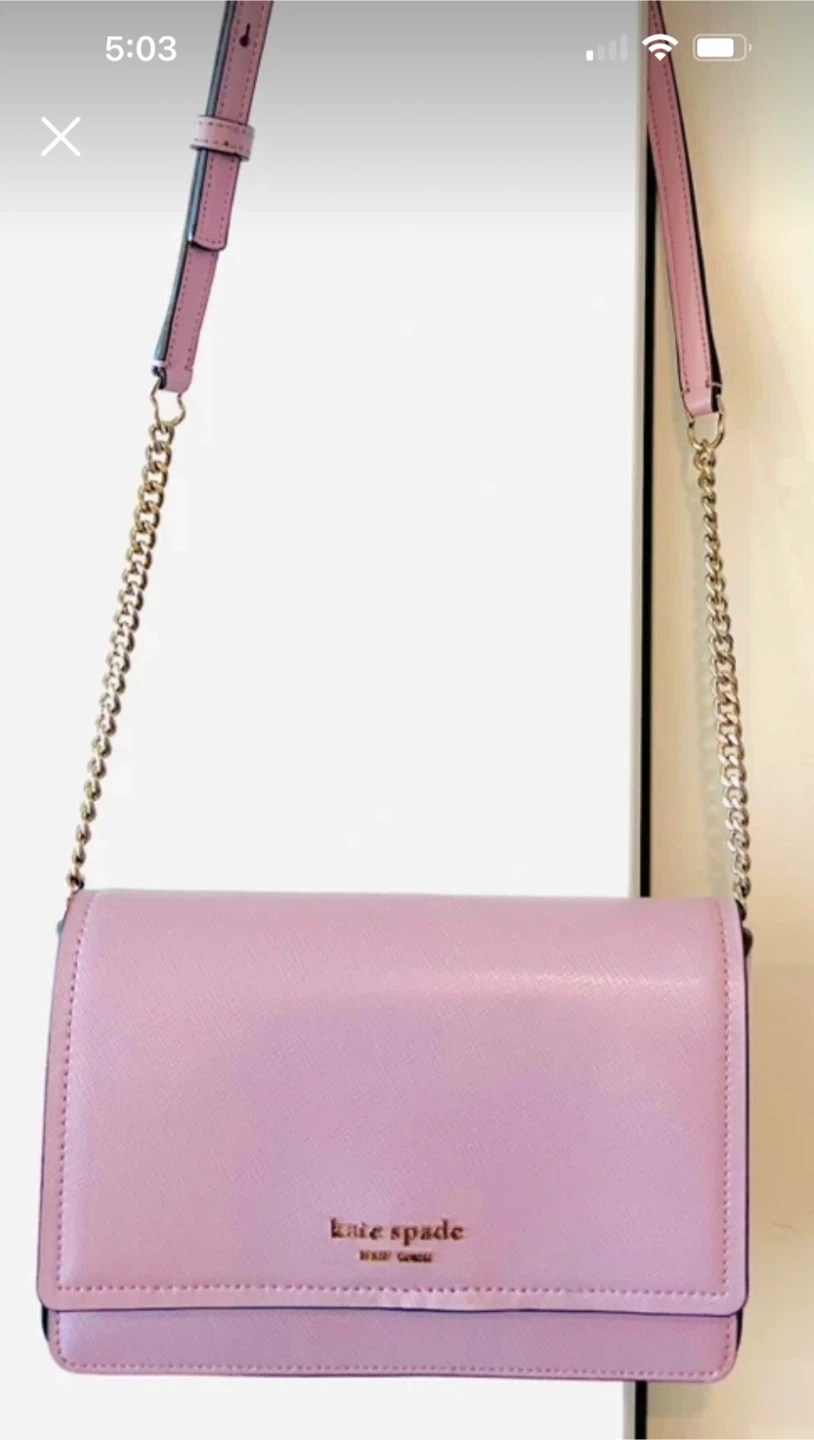 This is a Kate Spade New York shoulder bag. It's made of lavender saffiano leather. It features a silver-tone chain strap and a front flap closure with a snap button. The interior has multiple card slots and a zippered pocket. Can also be used as a clutch. This bag is perfect for a night out or everyday use! Beautiful Spring Color.😍