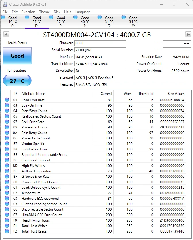 Refer to screenshots of DiskInfo for the health of the drives.
