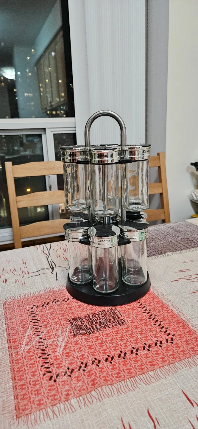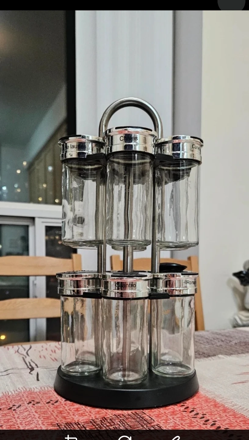 Selling a handy rotating spice rack! It comes with twelve clear glass jars, perfect for keeping your favourite spices organized and within easy reach. The rack is in great shape and will look great on any countertop.