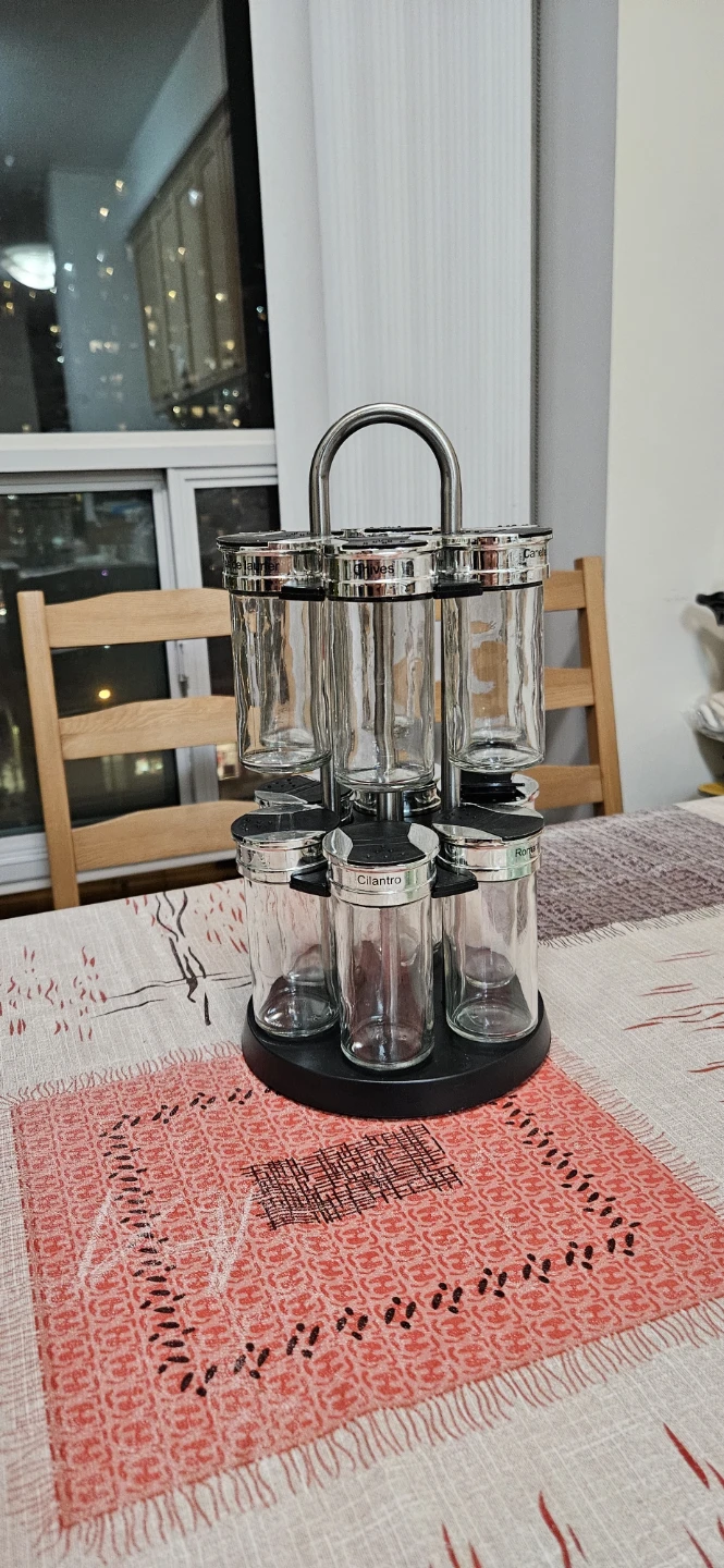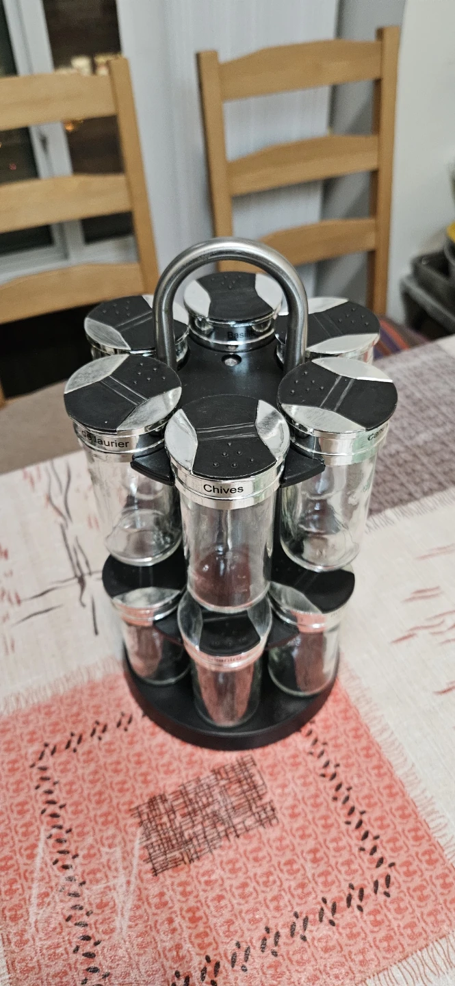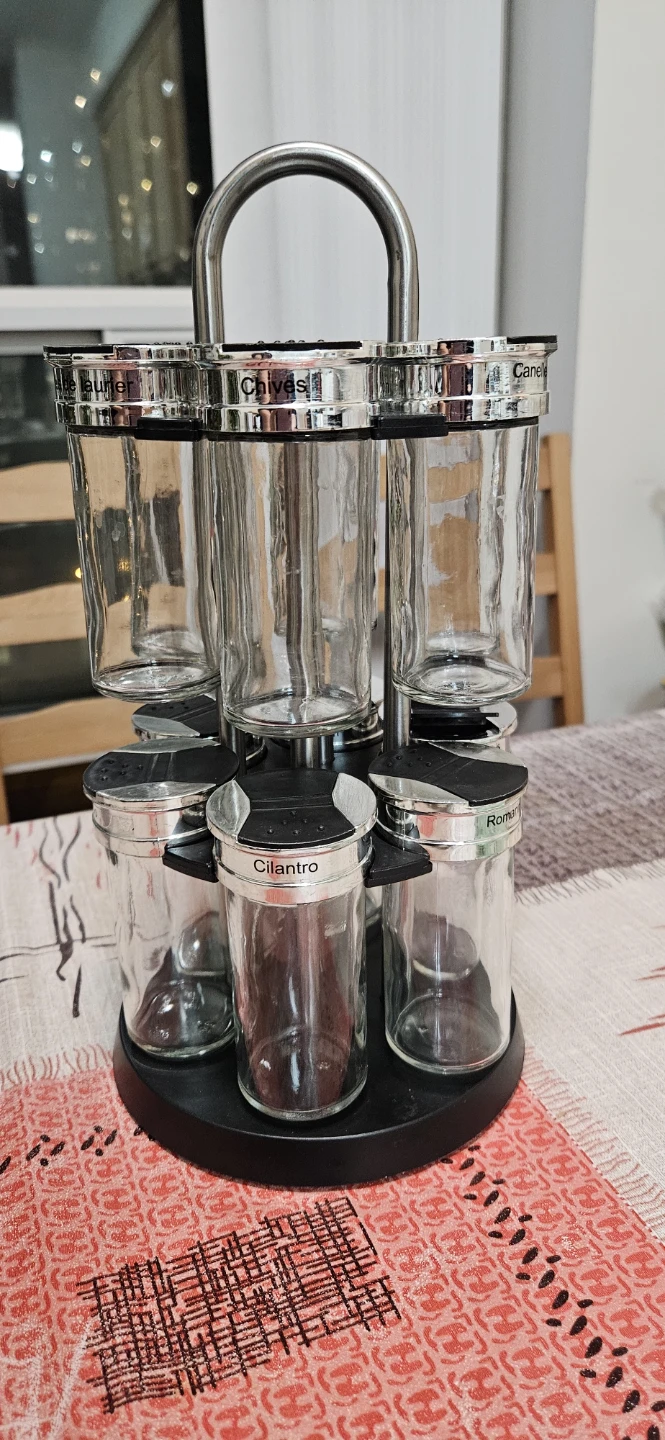 Selling a handy rotating spice rack! It comes with twelve clear glass jars, perfect for keeping your favourite spices organized and within easy reach. The rack is in great shape and will look great on any countertop.