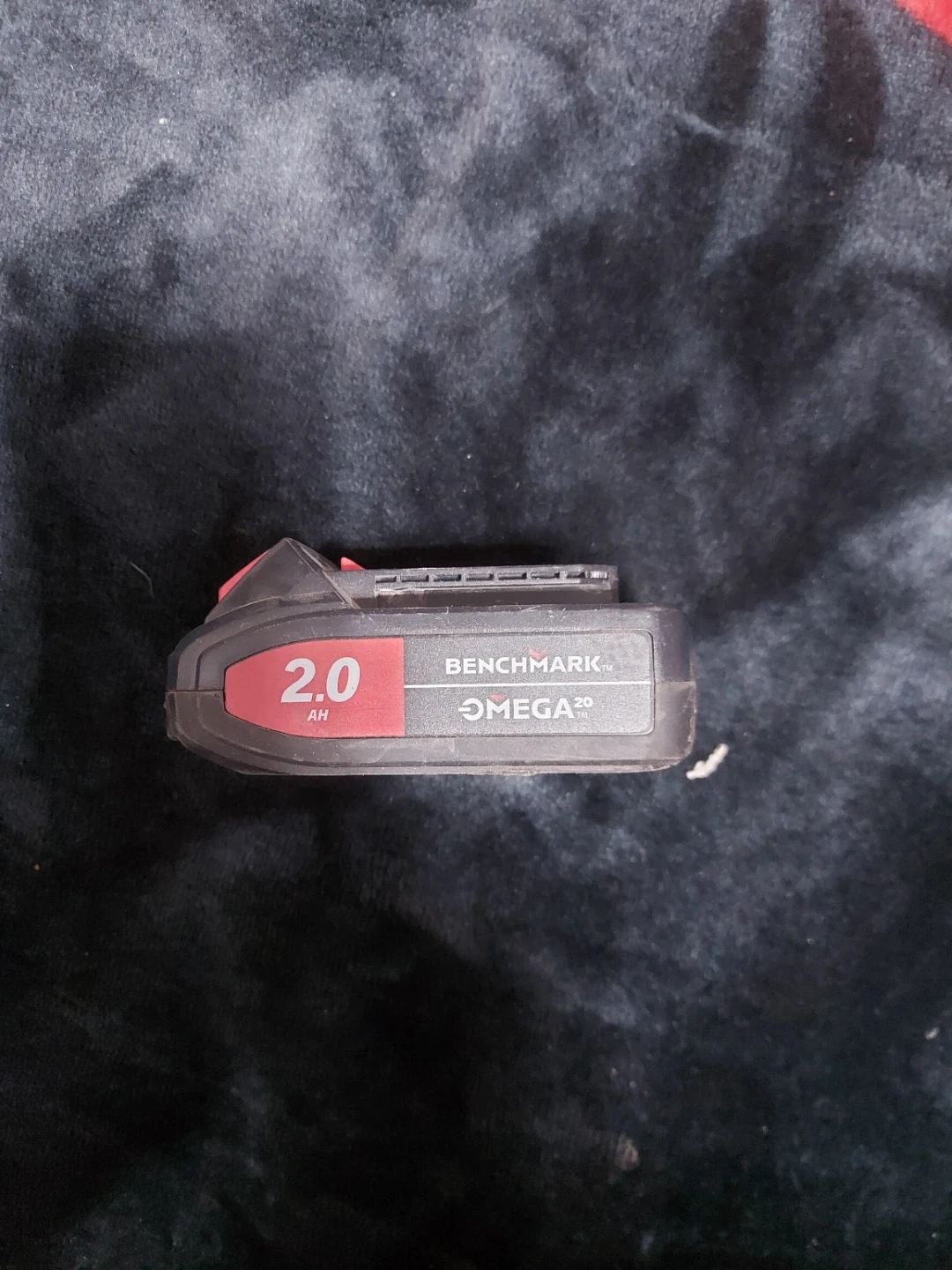Benchmark 2.0 Ah Omega battery. This power tool battery is a 2.0 amp hour unit. It's a standard rechargeable battery for various tools.