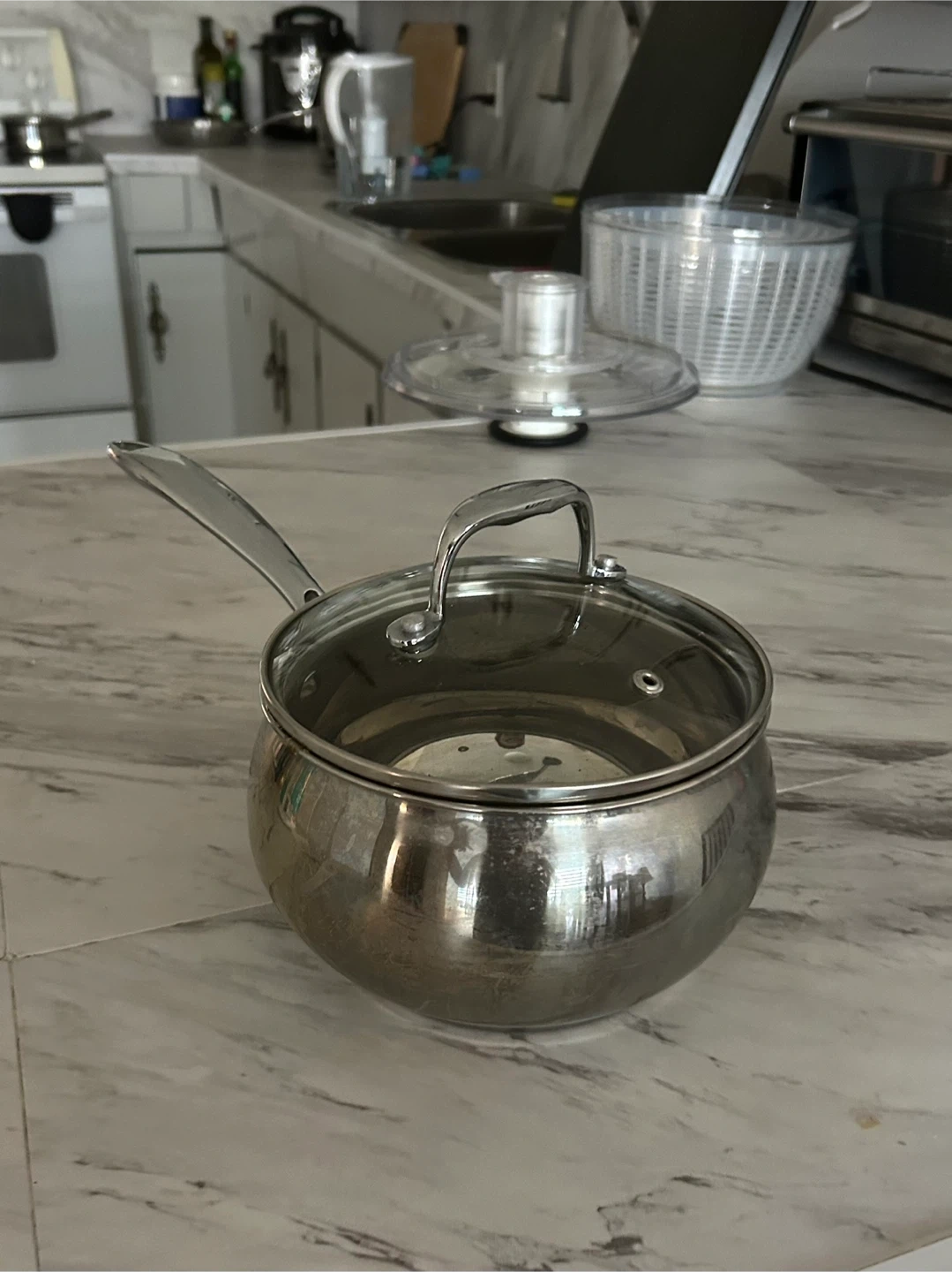 Selling a stainless steel saucepan. It includes a clear glass lid with a steam vent. The material is durable and easy to clean.