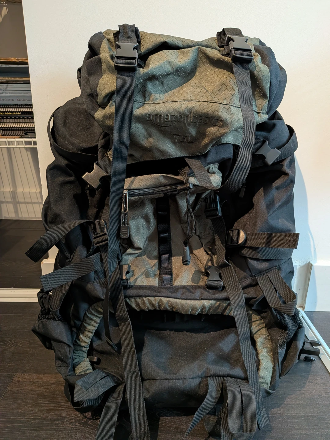 This is an AmazonBasics 75L hiking backpack in black and green camouflage. It features multiple compartments and adjustable straps for comfort. A large backpack for outdoor adventures!