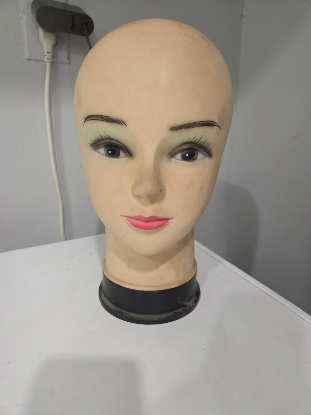 This is a mannequin head, perfect for displaying wigs, hats, or other accessories. It's made of a durable plastic material with painted features. A solid base helps it stand upright.
