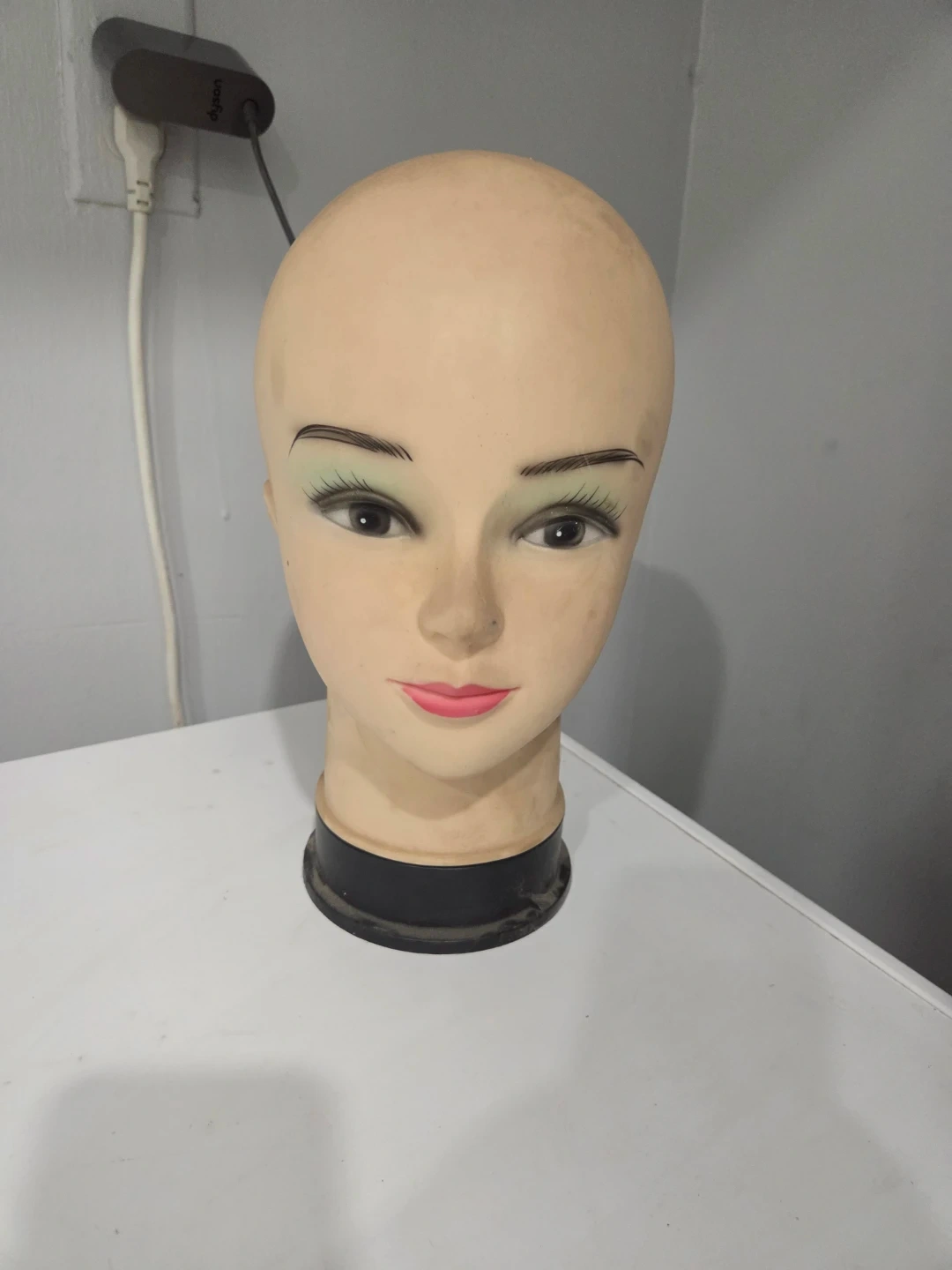 This is a mannequin head, perfect for displaying wigs, hats, or other accessories. It's made of a durable plastic material with painted features. A solid base helps it stand upright.