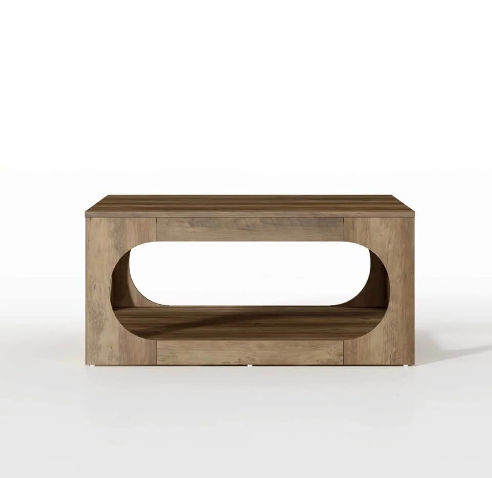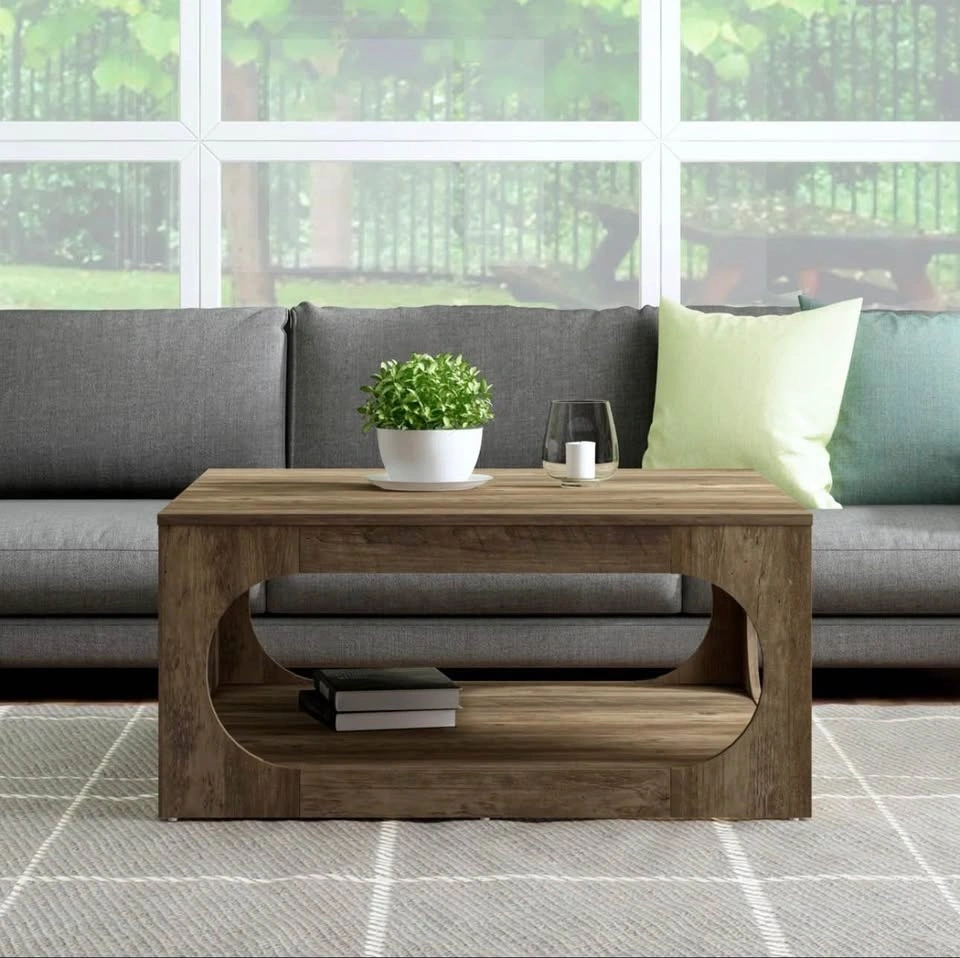 Modern square coffee table with a clean, architectural design and warm wood-look finish. Features a spacious lower shelf for books, trays, or décor, making it both stylish and functional for condos or living rooms.