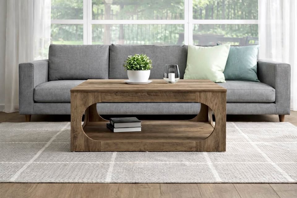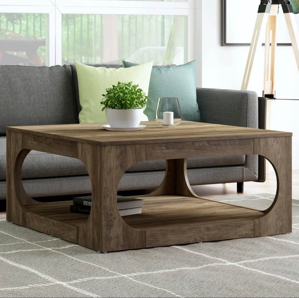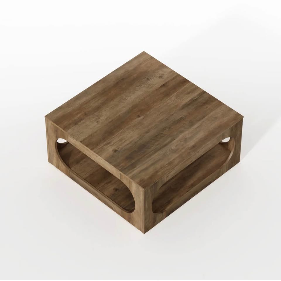 Modern square coffee table with a clean, architectural design and warm wood-look finish. Features a spacious lower shelf for books, trays, or décor, making it both stylish and functional for condos or living rooms.