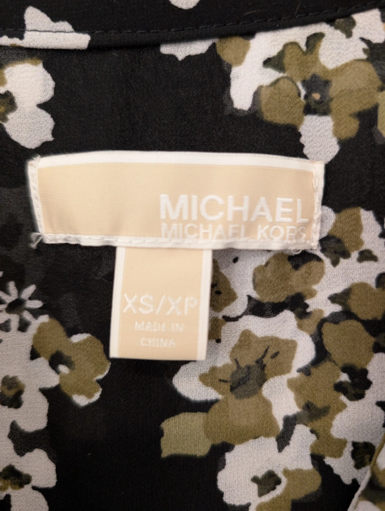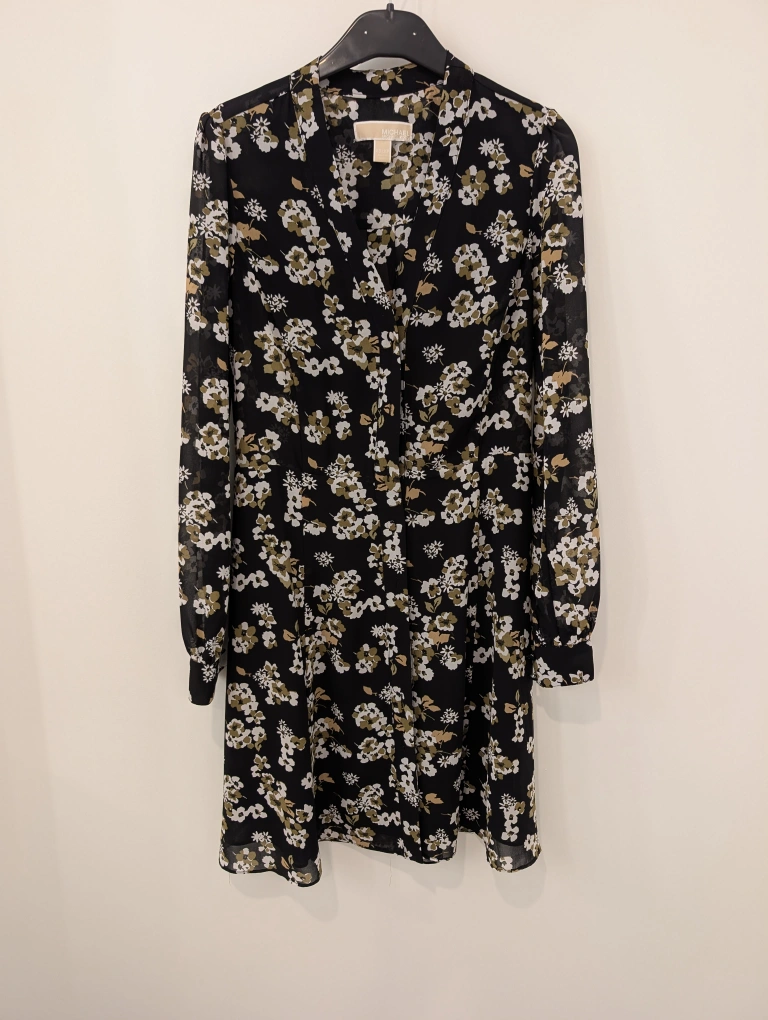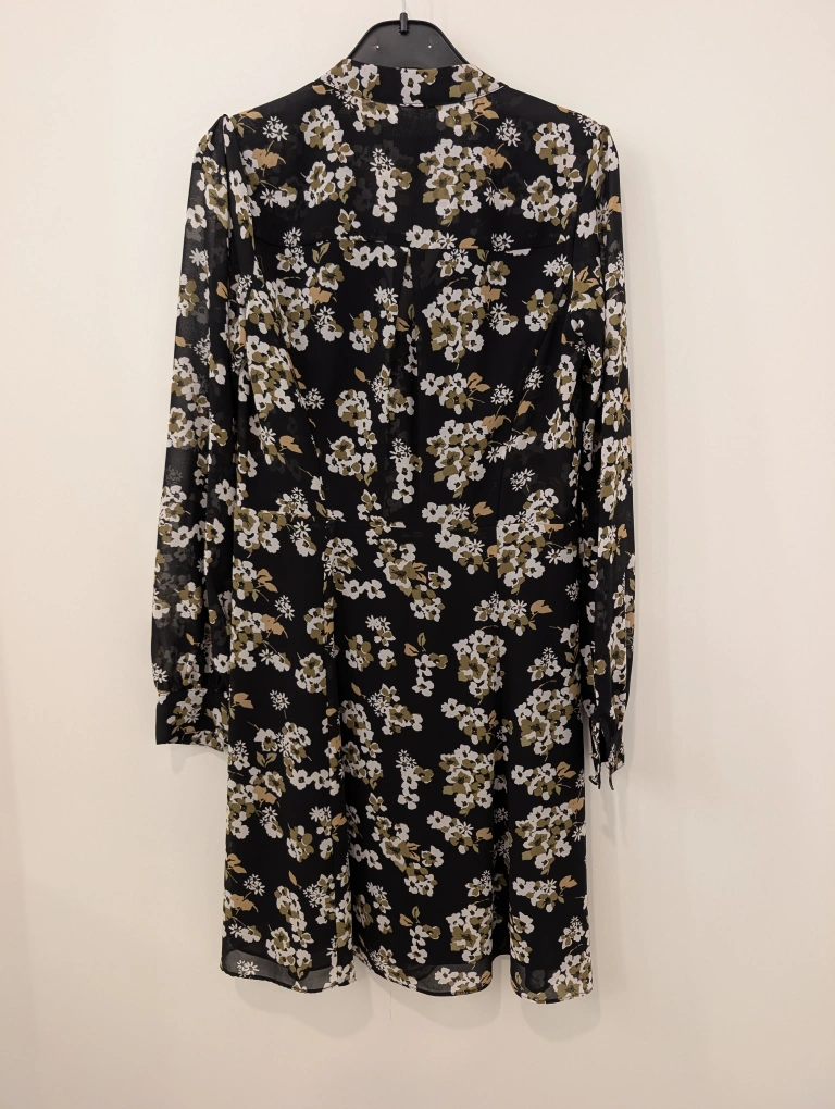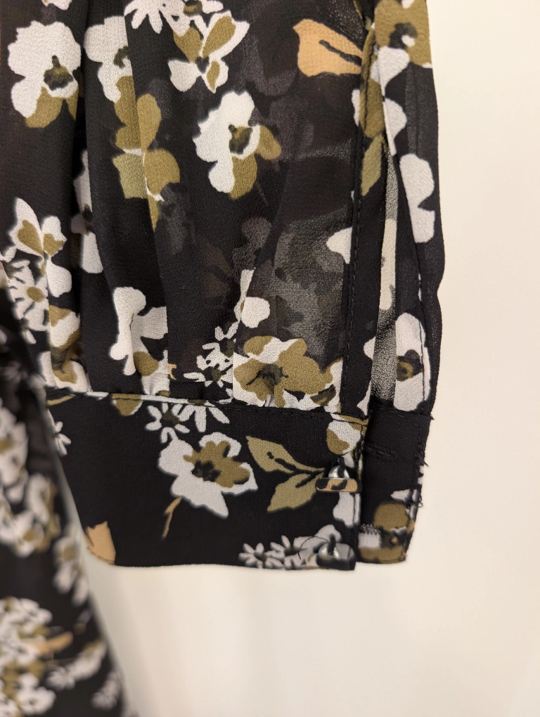 A black floral, sheer, button down dress. Long sleeves. Small V-neck. Slit cuffs. A beautiful and comfortable dress for any season.