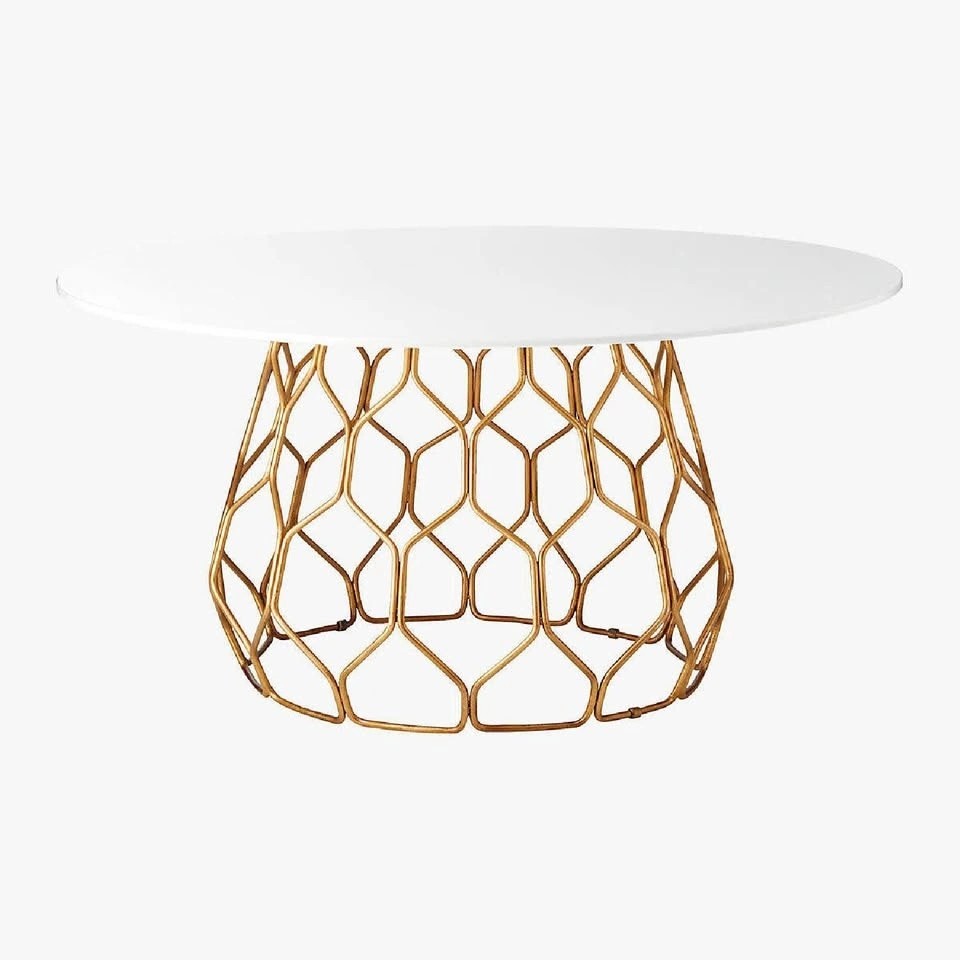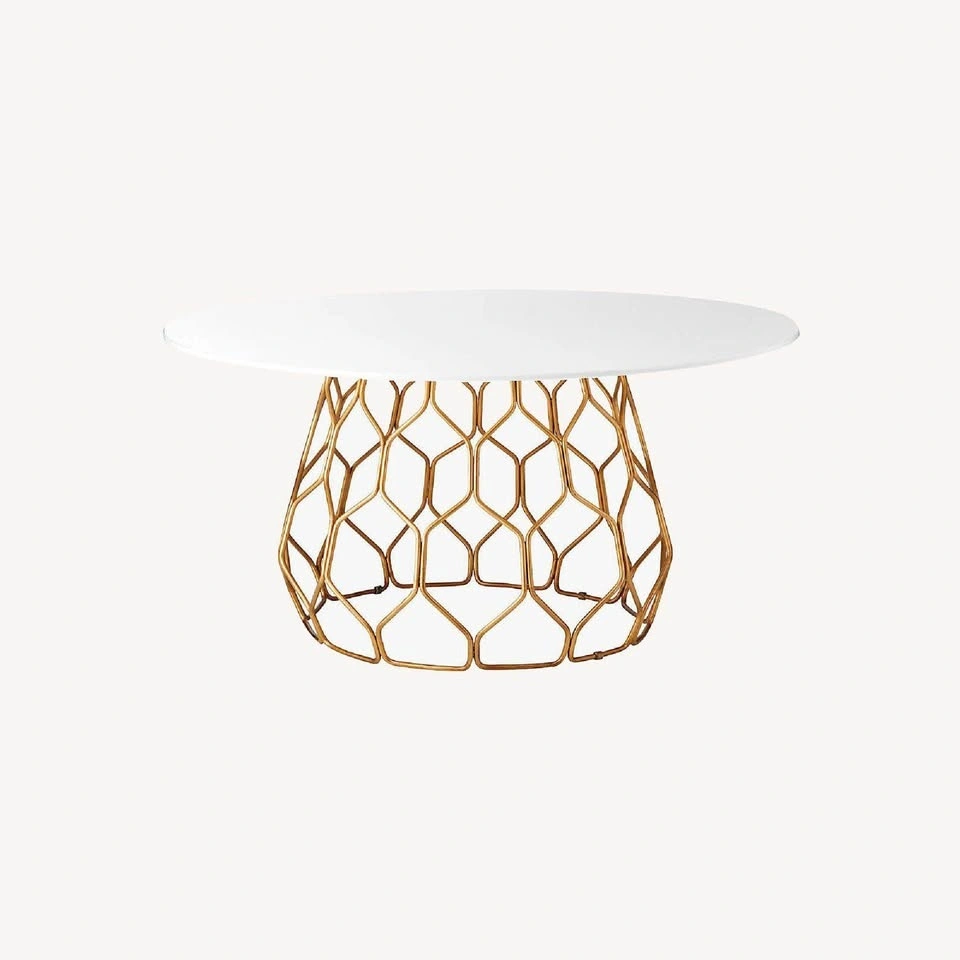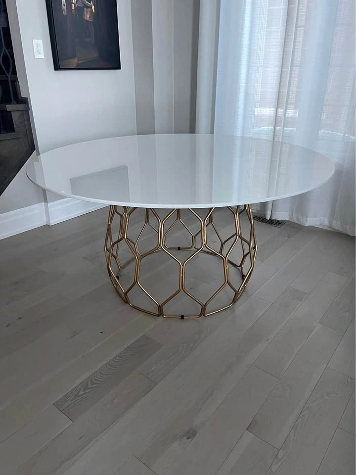 Quartz stone top & gold base. The composite top is easily wipeable and very sturdy. Table is in excellent condition. Table comfortably seats 8-10. Measurements: Width - 60 inches, Height - 30 inches, Depth - 60 inches.