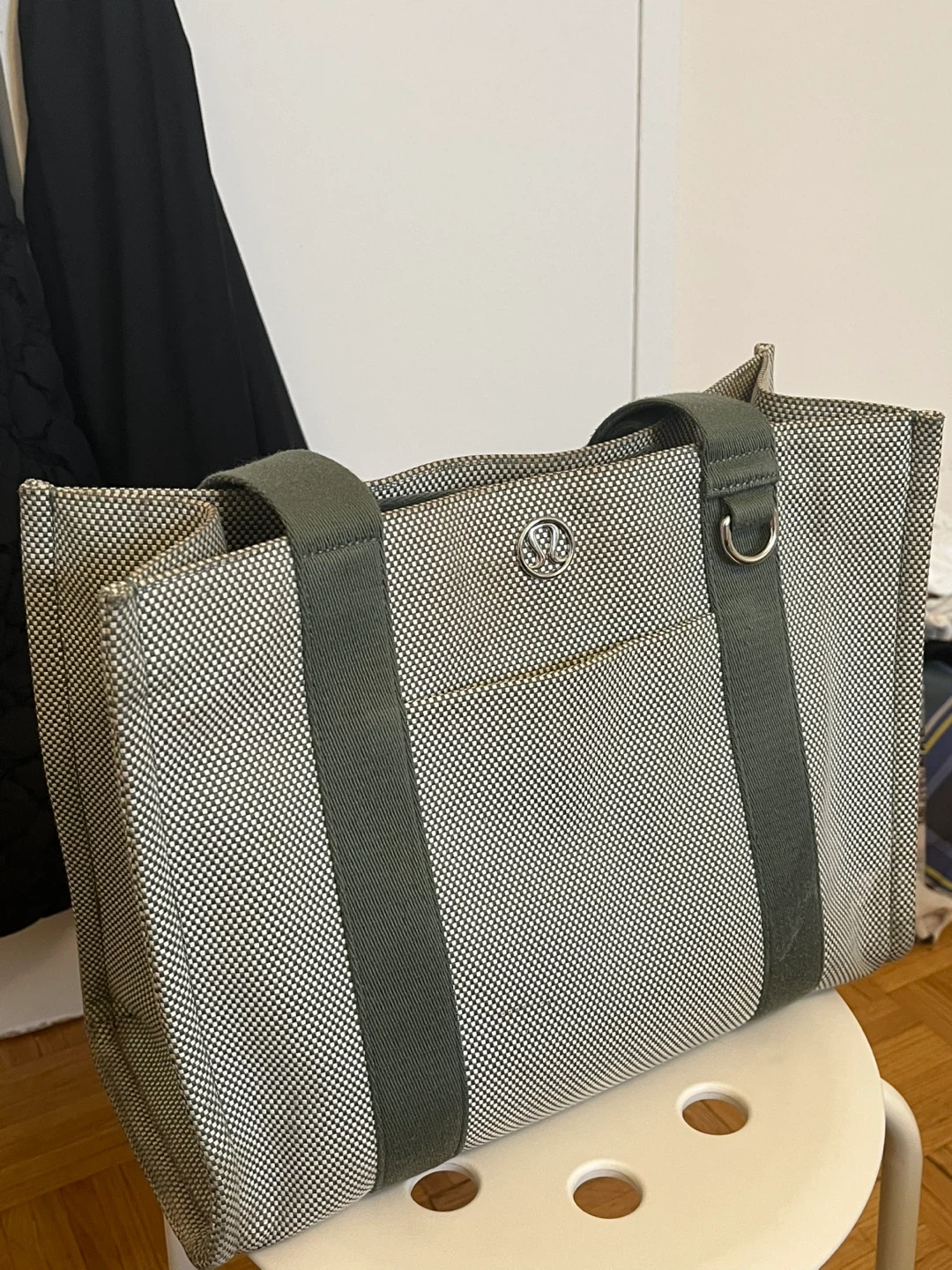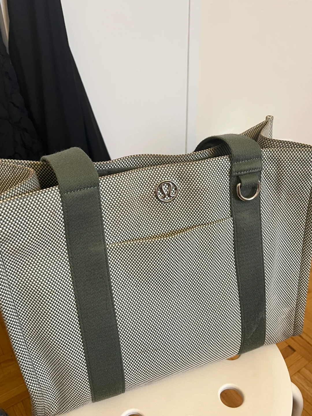 This Lululemon tote bag has a checkered pattern with dark green straps. It's a stylish and functional accessory. Great for everyday use!