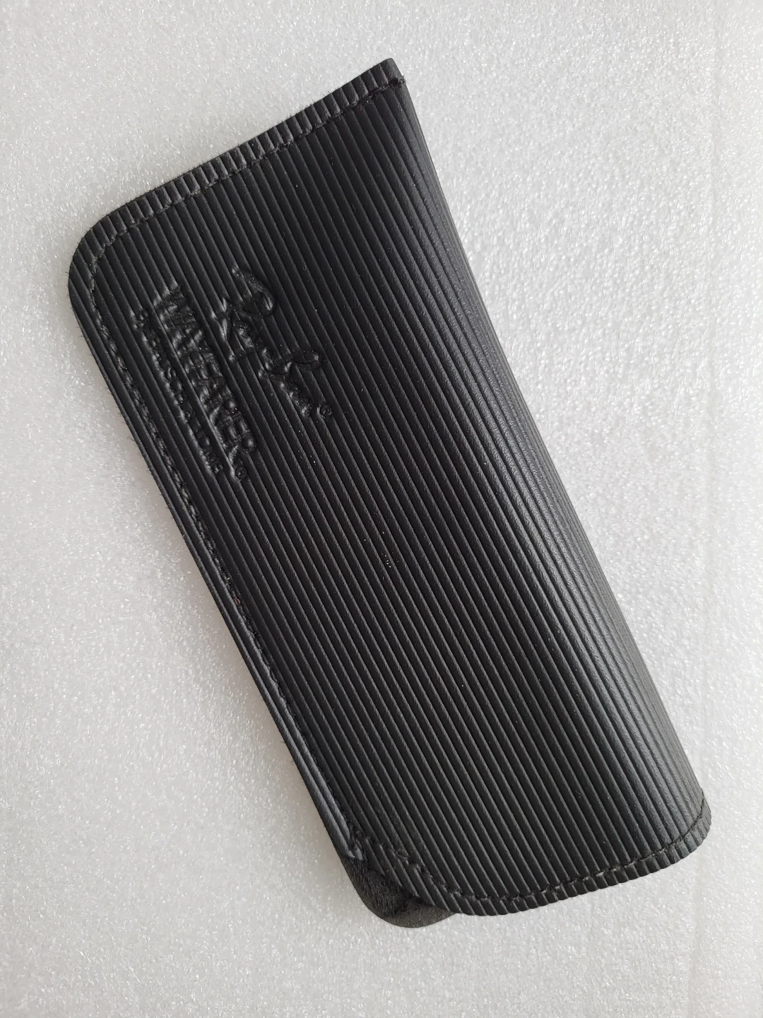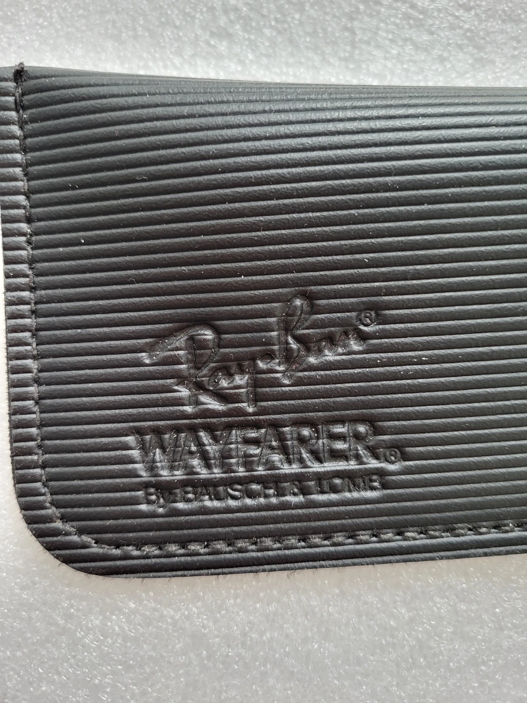 Black ribbed faux leather eyeglass case. Features the Ray-Ban logo and Wayfarer text. By Bausch & Lomb. Protects your glasses!