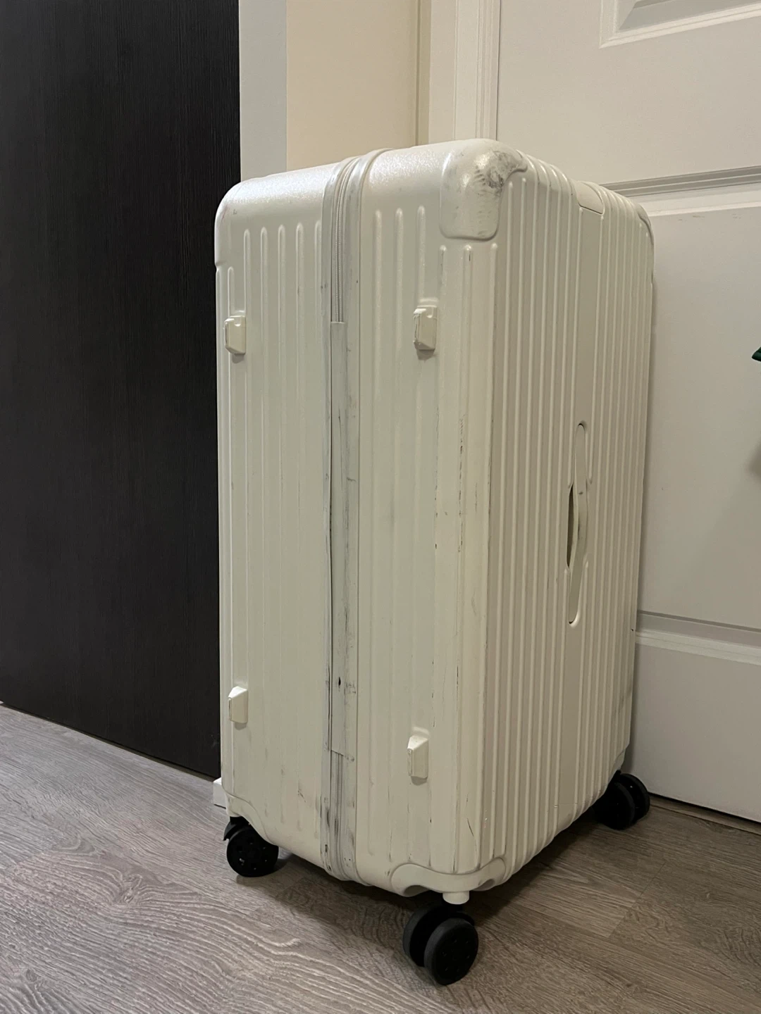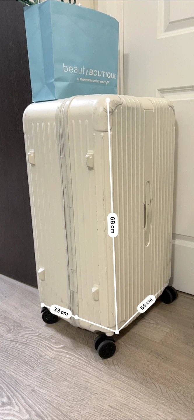 Selling a used suitcase. It's white and measures approximately 68 cm tall, 55 cm wide, and 33 cm deep. It shows some signs of wear, but it's still functional and ready for your next trip