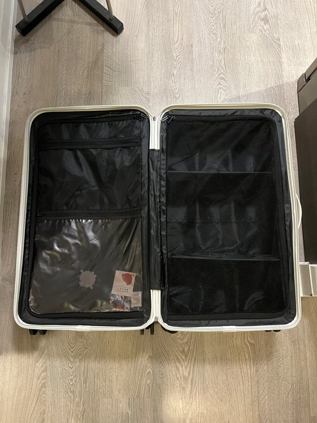 Selling a used suitcase. It's white and measures approximately 68 cm tall, 55 cm wide, and 33 cm deep. It shows some signs of wear, but it's still functional and ready for your next trip