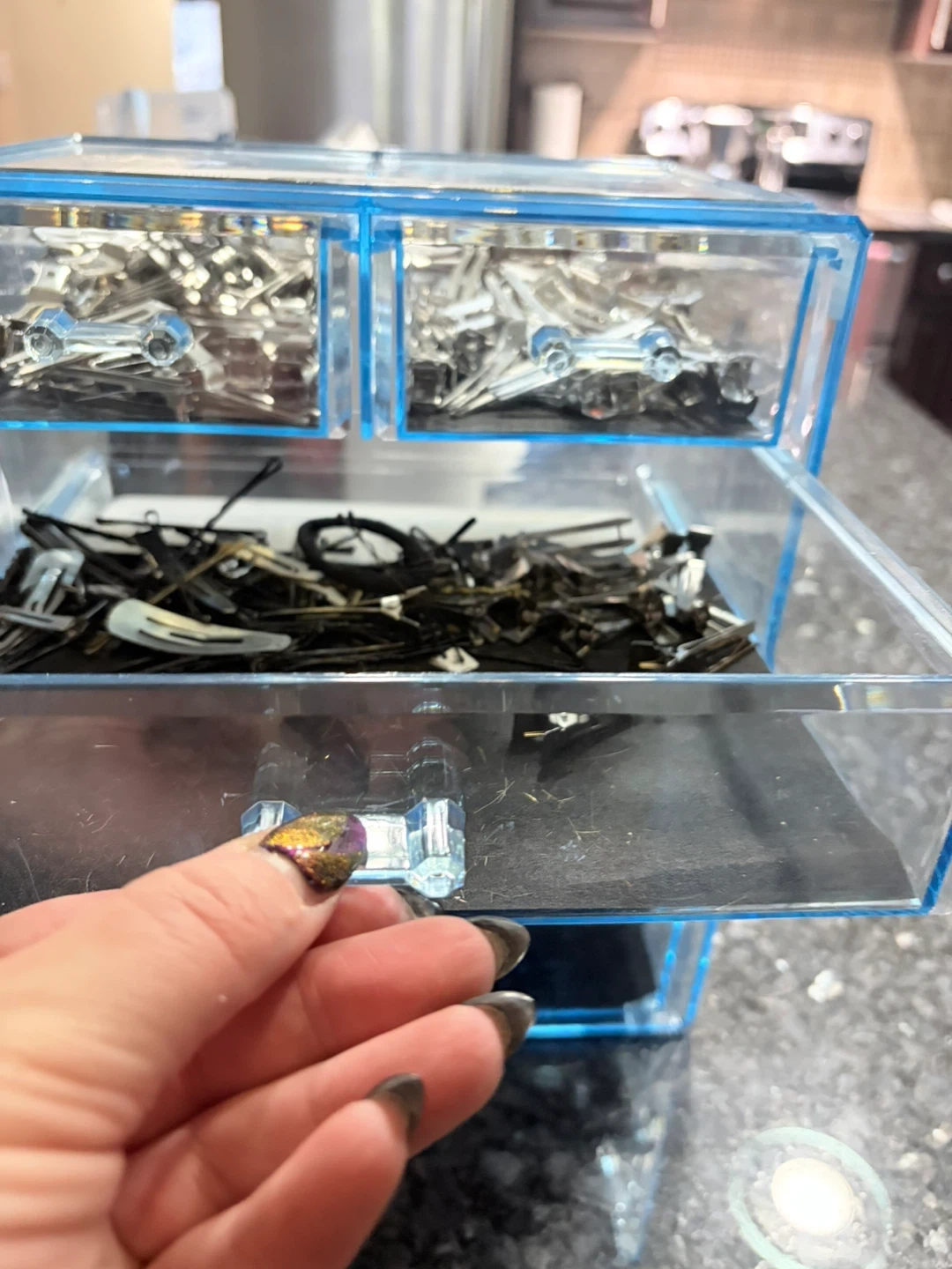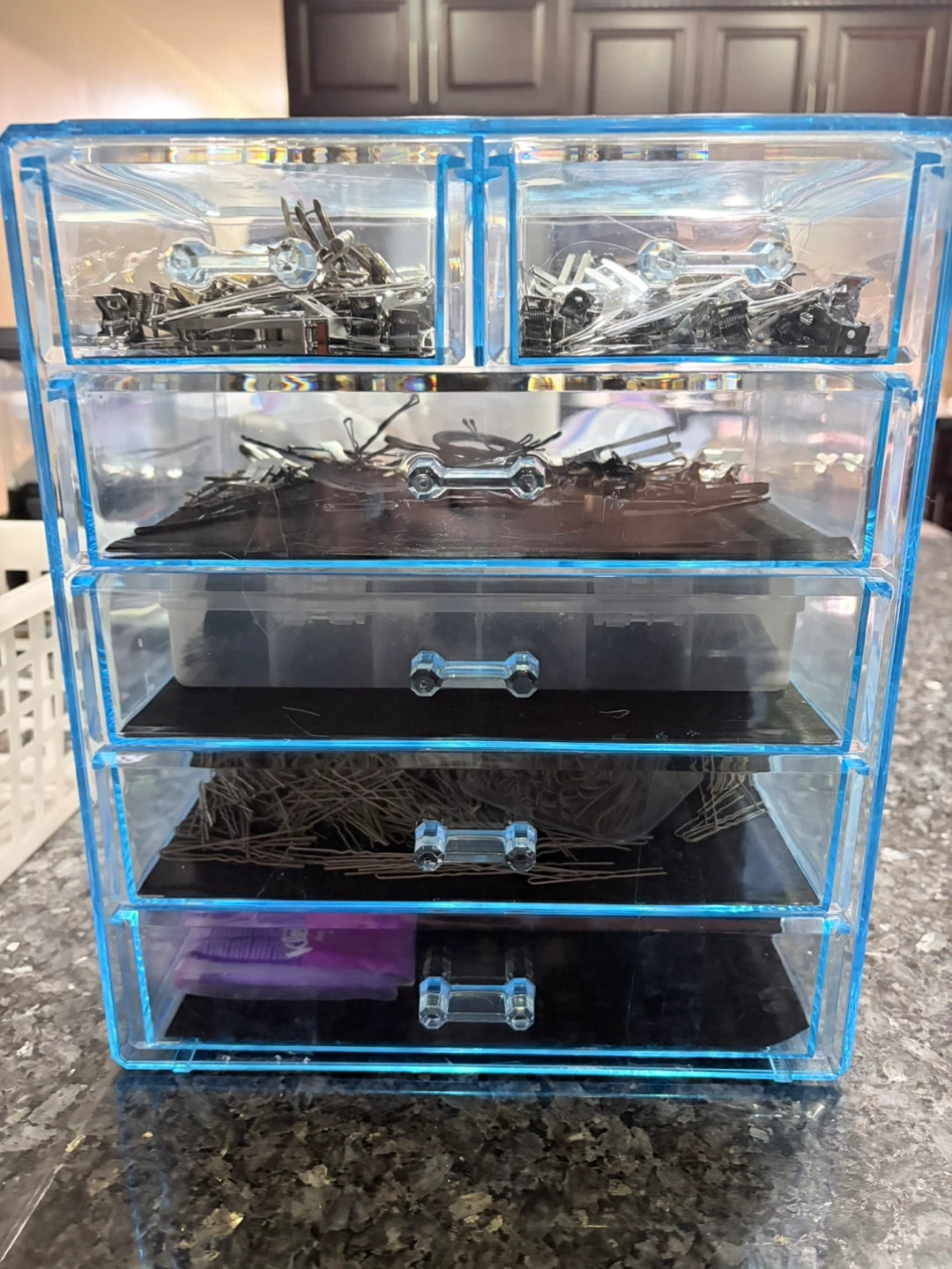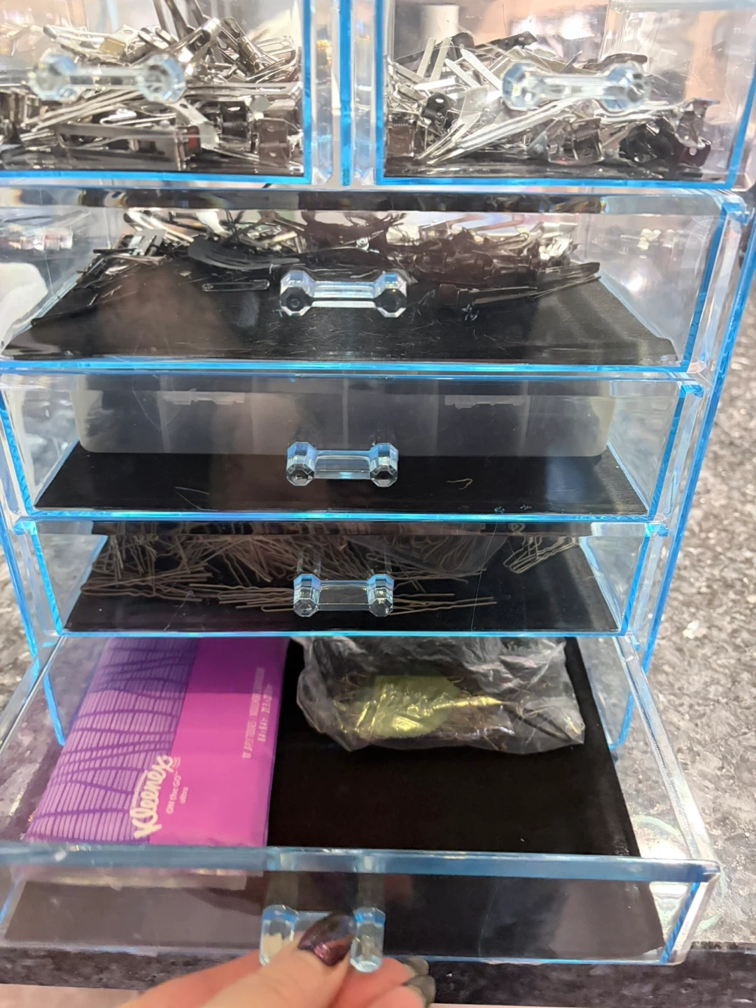 This organizer features four clear drawers, perfect for storing hair clips, bobby pins, and elastics. It's great for keeping crafting supplies or small accessories tidy. The transparent design makes it easy to see what's inside!