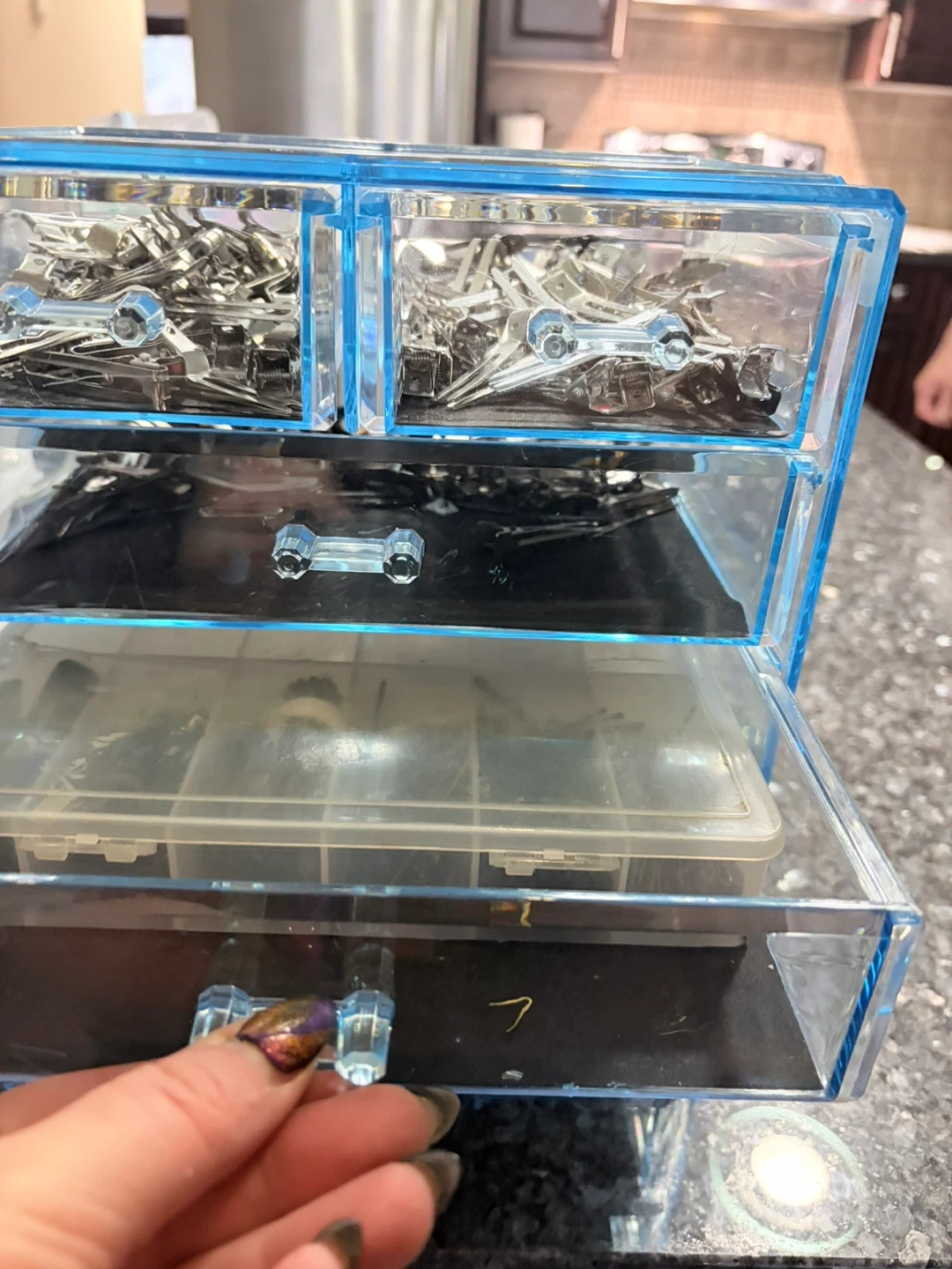 This organizer features four clear drawers, perfect for storing hair clips, bobby pins, and elastics. It's great for keeping crafting supplies or small accessories tidy. The transparent design makes it easy to see what's inside!