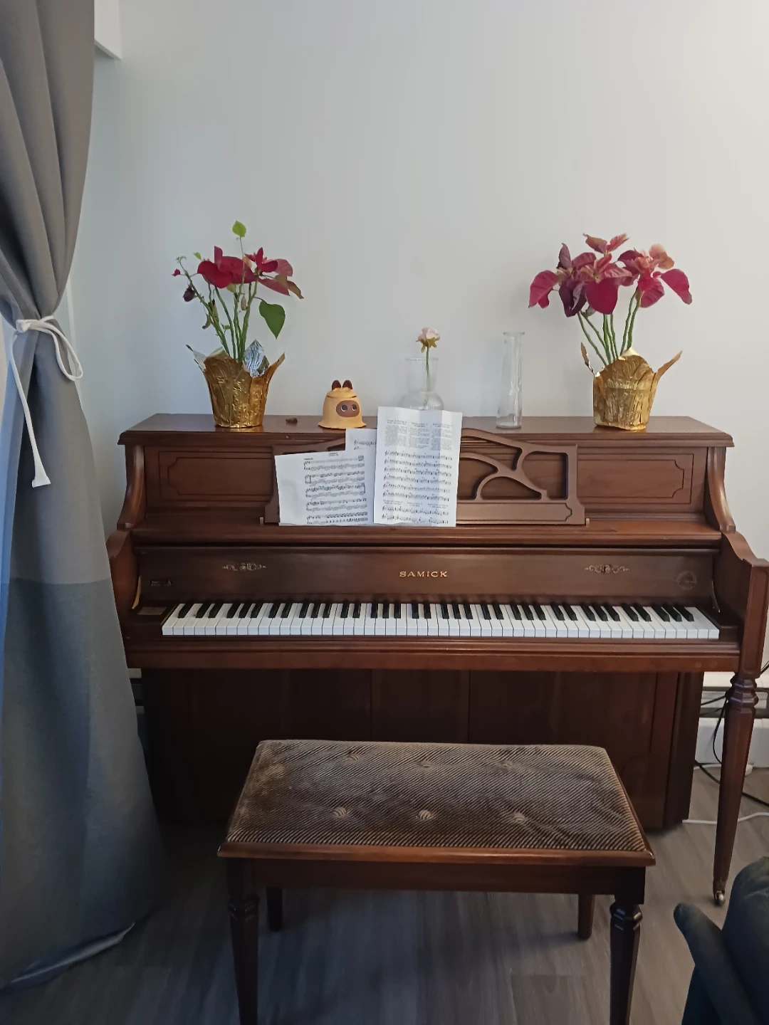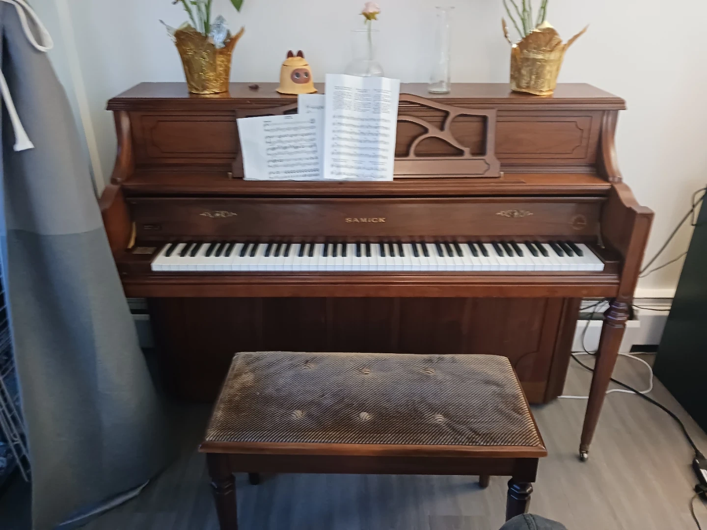 This is a beautiful upright piano from Samick, featuring an Imperial German Scale. It's a classic piece for any music enthusiast. The piano has a rich wooden finish and includes a matching bench. Perfect for learning or playing your favourite tunes! 저도 나눔받은거에요. 운반비알아보셔서 가져가시면됩니다. 타운홈1층이라엘베없이 이동가능합니다