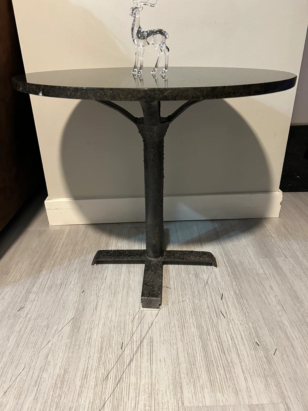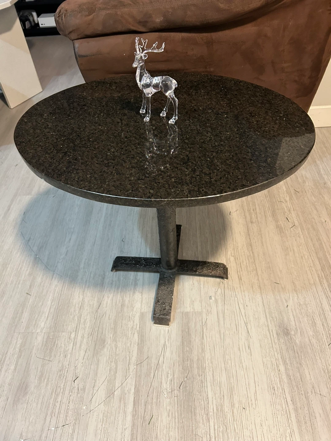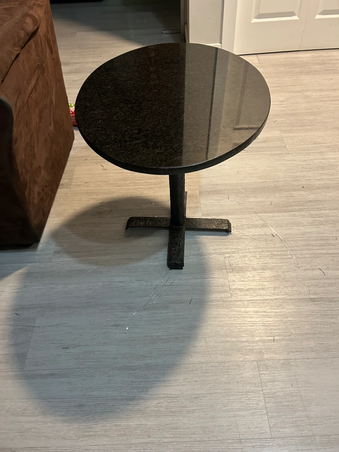 This round side table features a granite top with a pedestal base. It's perfect for placing next to a sofa or armchair. The speckled granite offers a durable and stylish surface.