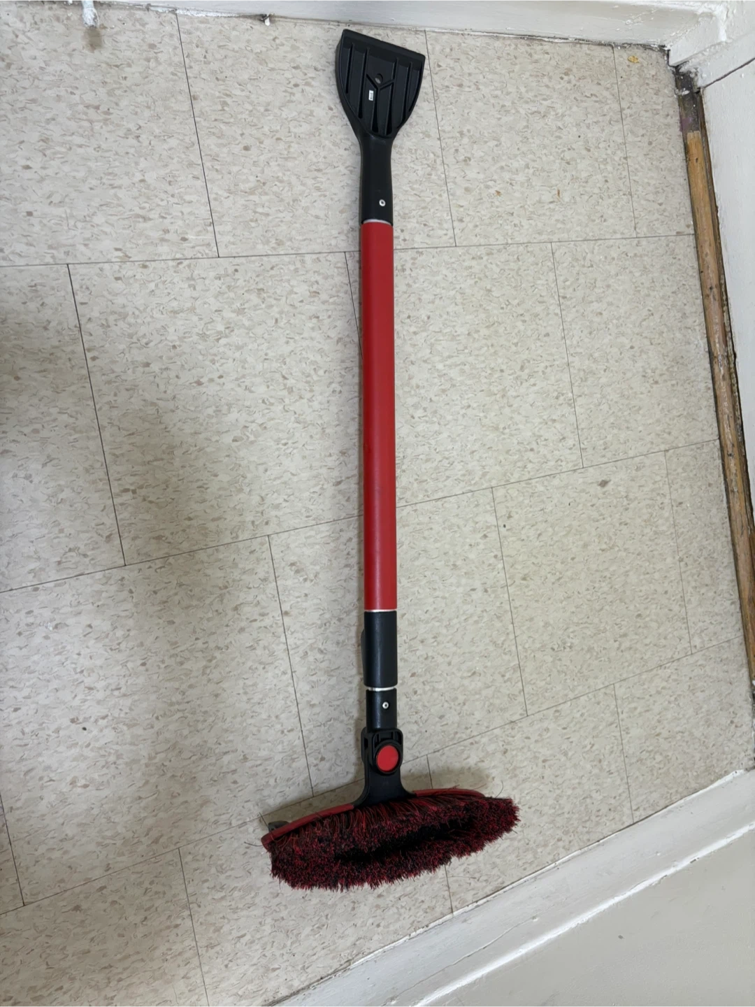 This extendable snow brush features a built-in ice scraper for clearing your windshield. It has a sturdy red handle and a pivoting brush head. The scraper's teeth are designed to break up thick ice. It's useful for any driver during winter months! $5