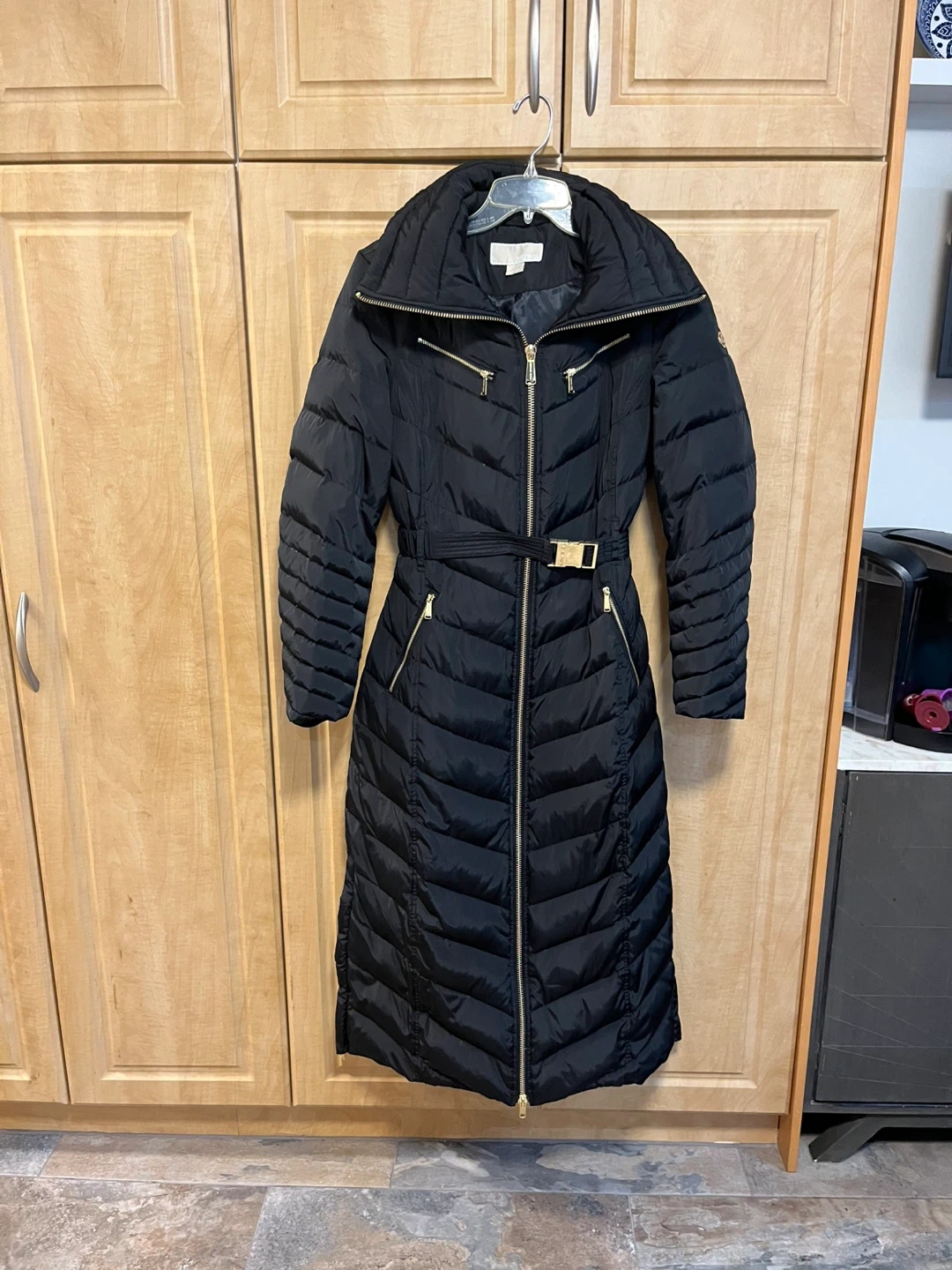 Selling a size S Michael Kors LONG black puffer coat keeps your legs super warm in winter especially if wearing a dress. It's in great condition and ready to keep you warm this winter with 100% down filled. Neck zips right up to give extra layer of warmth. The coat features a stylish design with a belted waist and gold-tone zippers. Asking $140. Pickup north Ajax.
