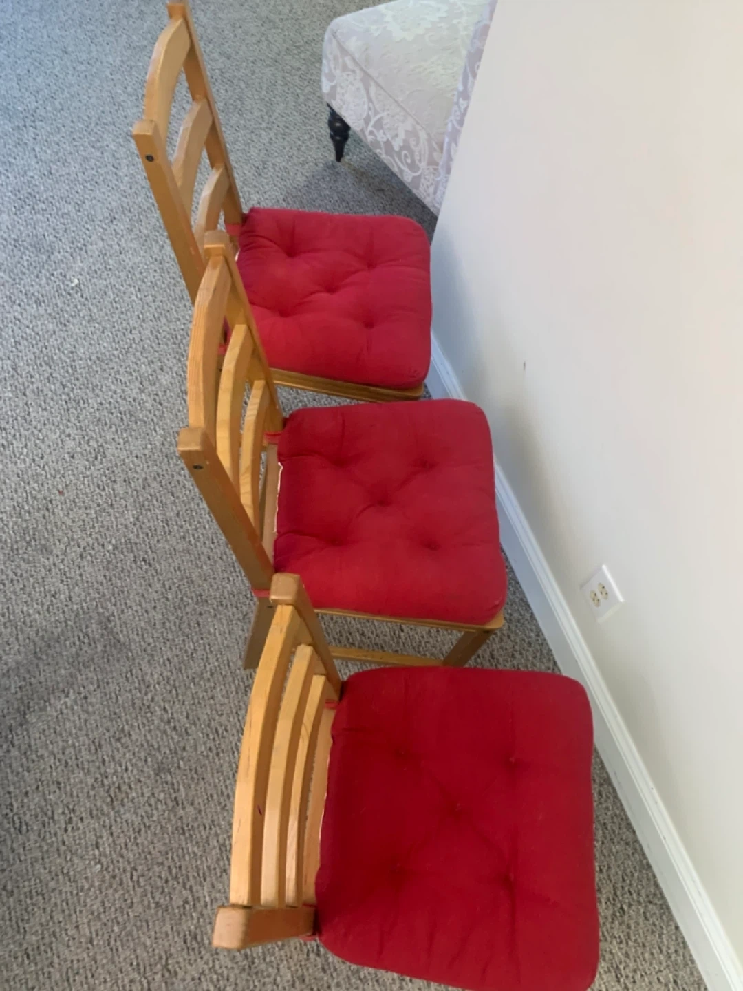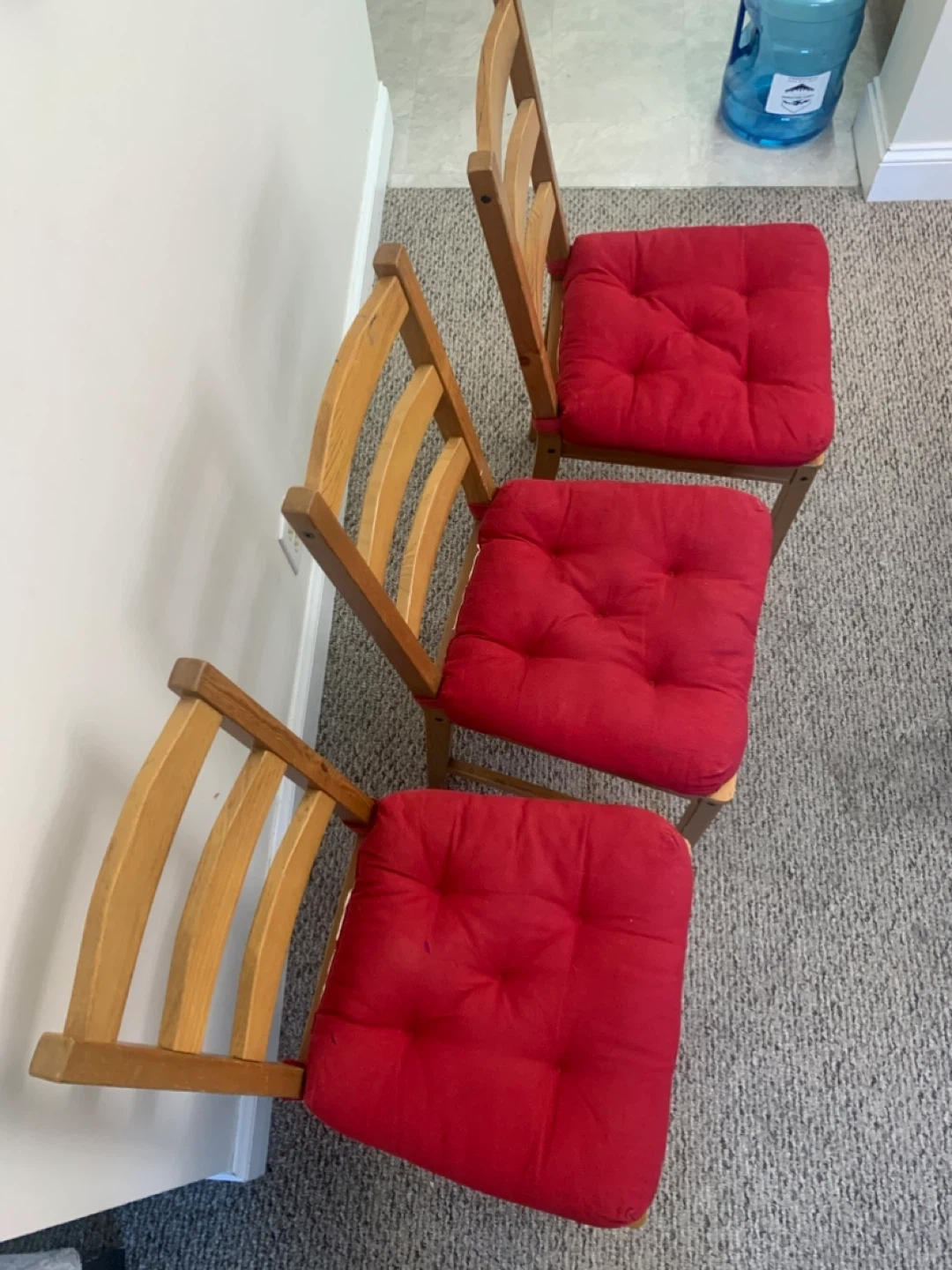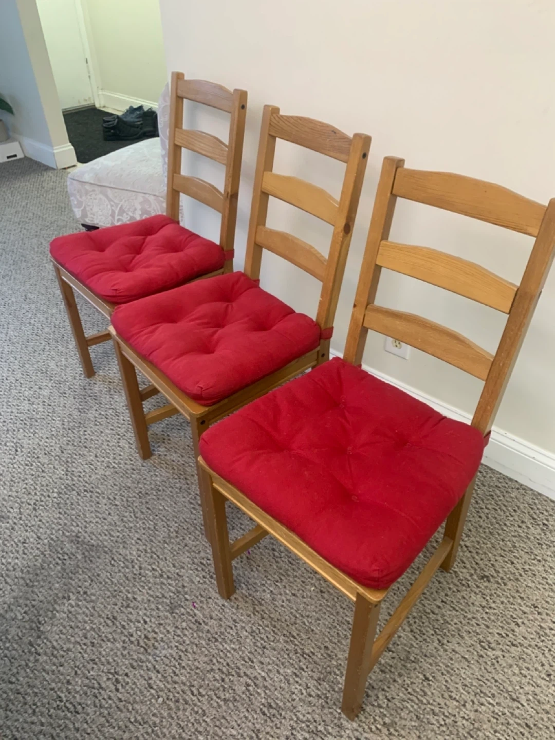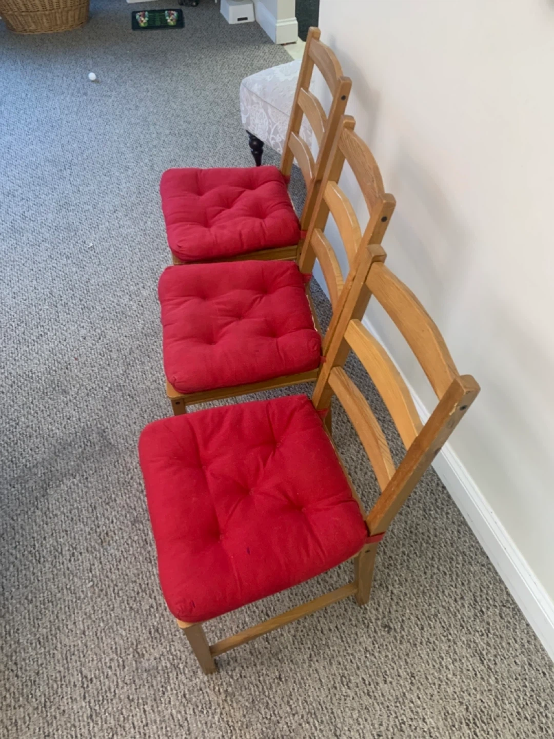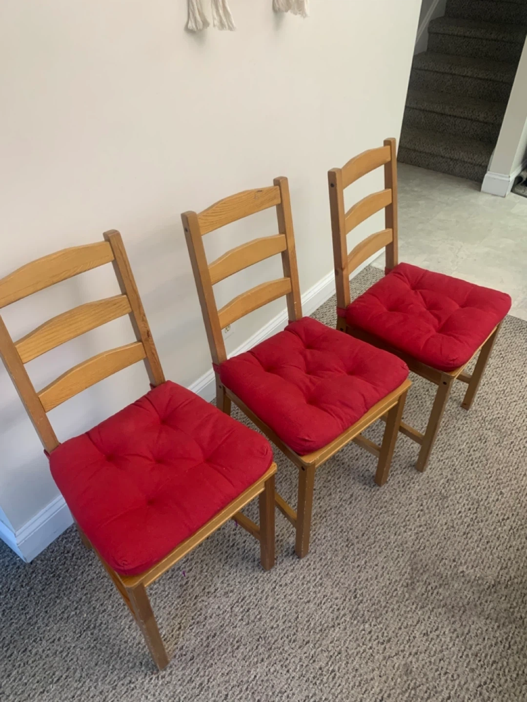 Selling a set of three wooden chairs, each with a comfy red cushion! They're in good condition and would be great for a dining room or kitchen. The wood has a nice, natural finish. Perfect for adding a pop of colour to your space