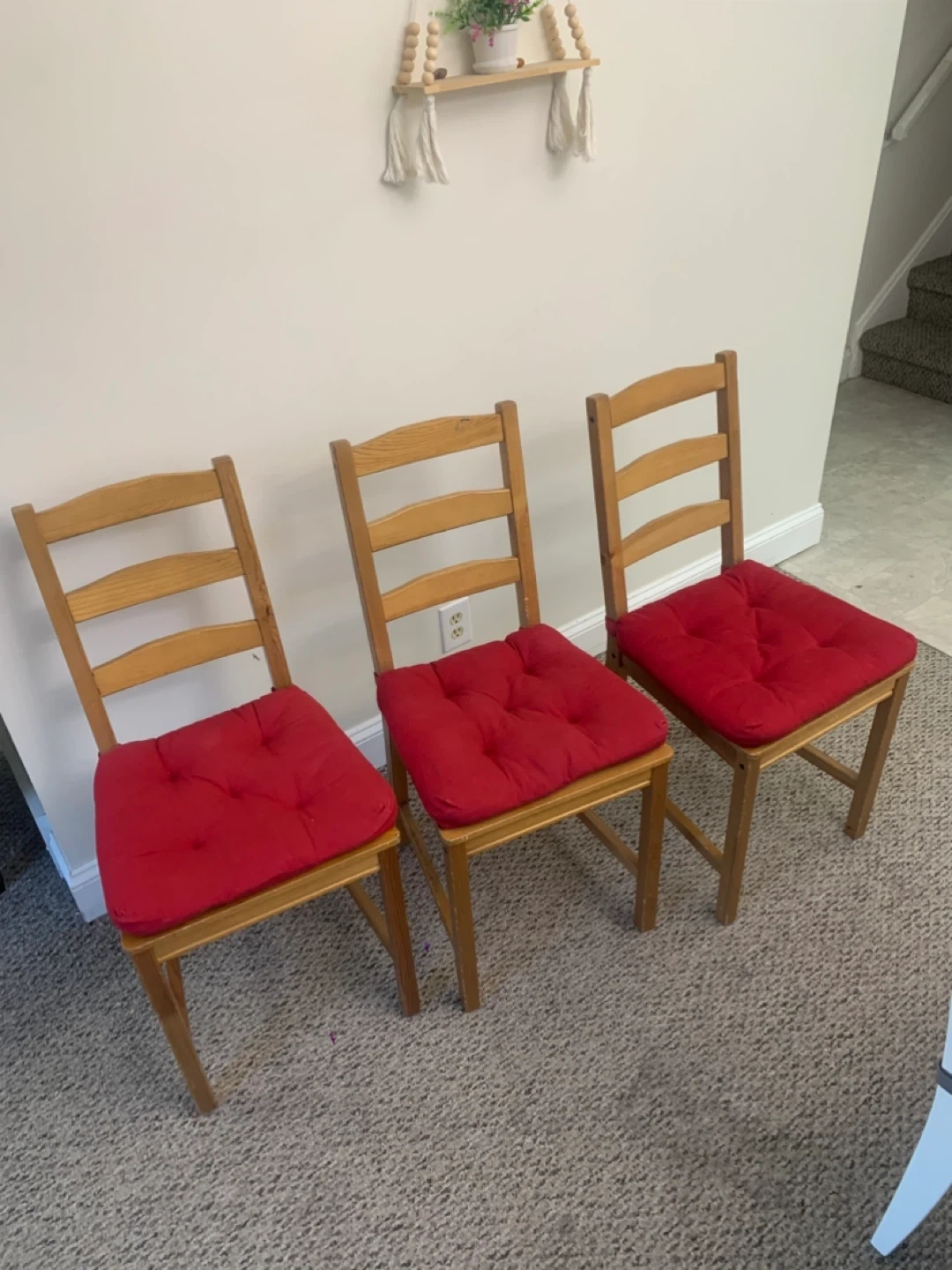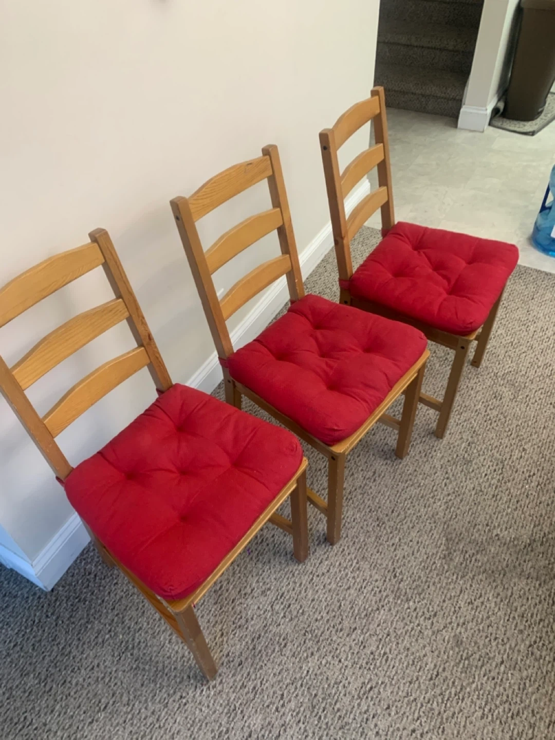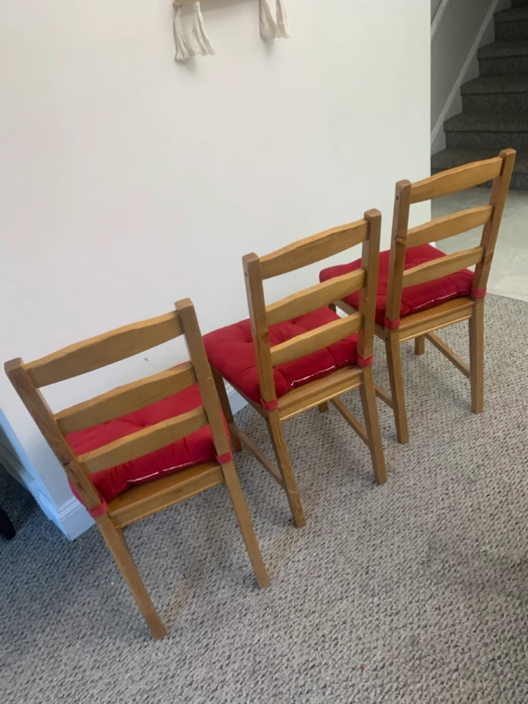 Selling a set of three wooden chairs, each with a comfy red cushion! They're in good condition and would be great for a dining room or kitchen. The wood has a nice, natural finish. Perfect for adding a pop of colour to your space