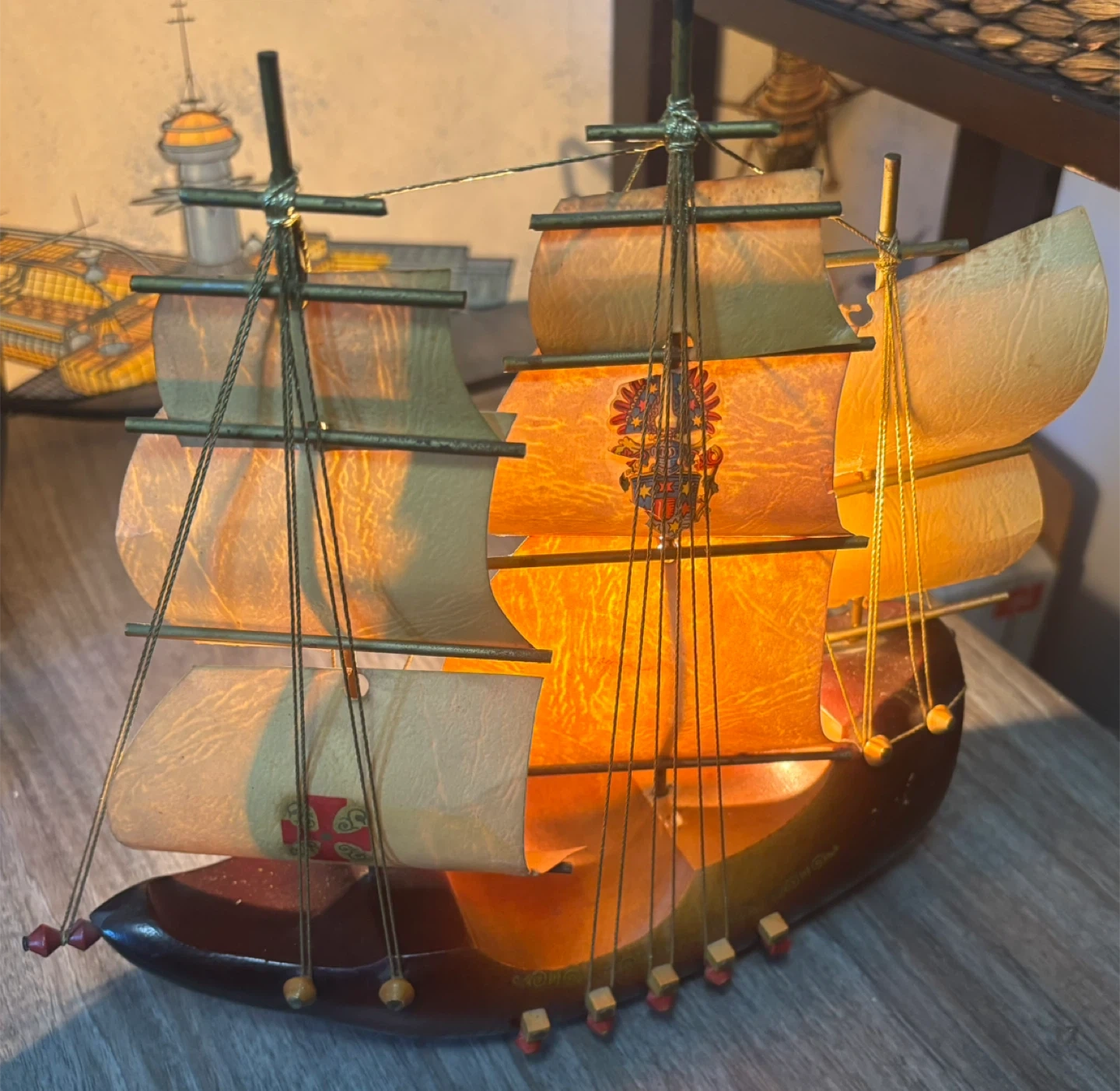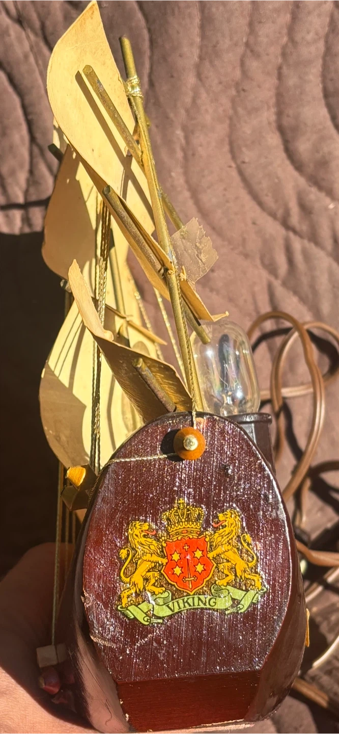 This vintage Viking ship lamp features a detailed wooden hull and fabric sails. It's lit by a single bulb, casting a warm glow. The lamp includes a power cord and a decorative crest on the hull.