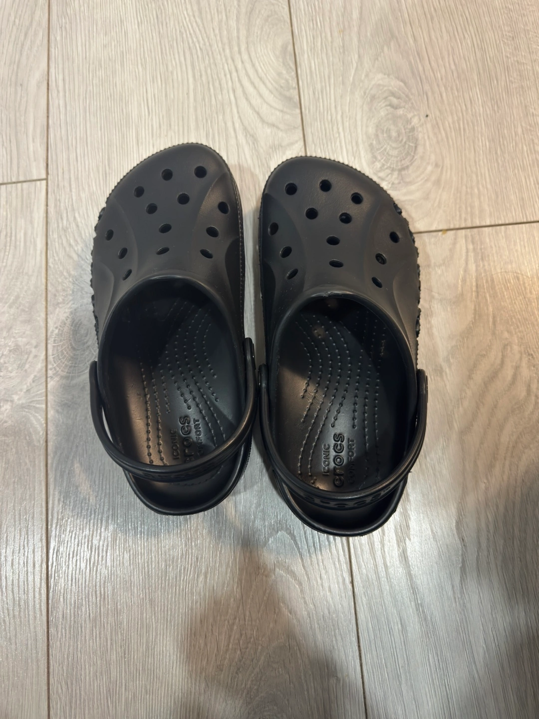 Selling a pair of classic baya Crocs clogs in black! They're super comfy and in great shape. Perfect for everyday wear or just kicking around the house. Size J2