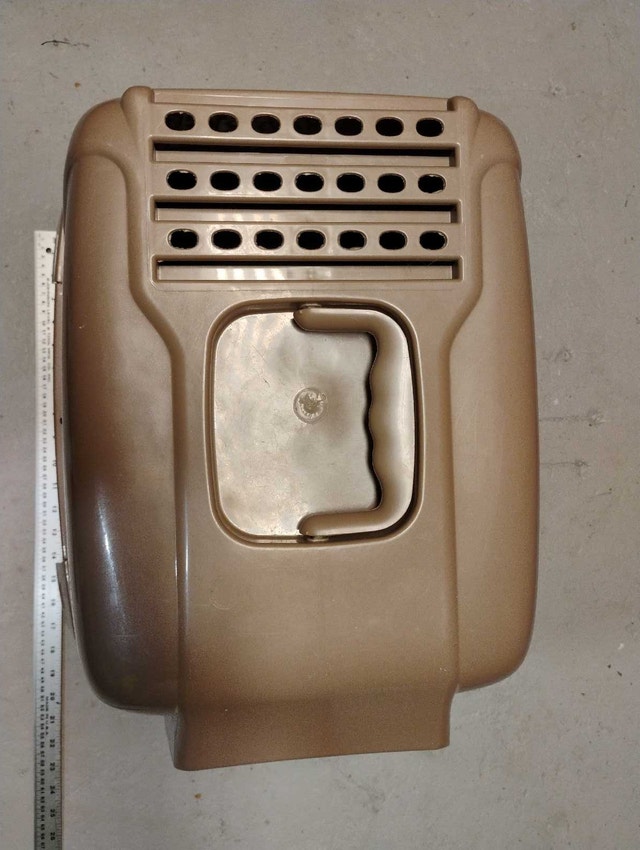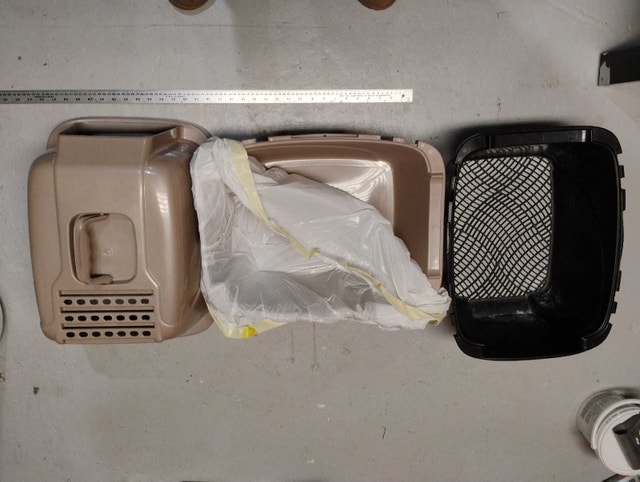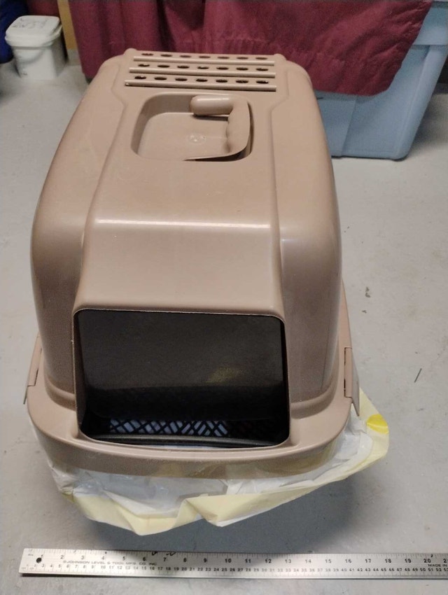 This is a used small kitty litter box, perfect for kittens or smaller cats, offering a cozy and private bathroom space. It has 3 components: the base, a midsection with a door, and the top. Cash accepted.