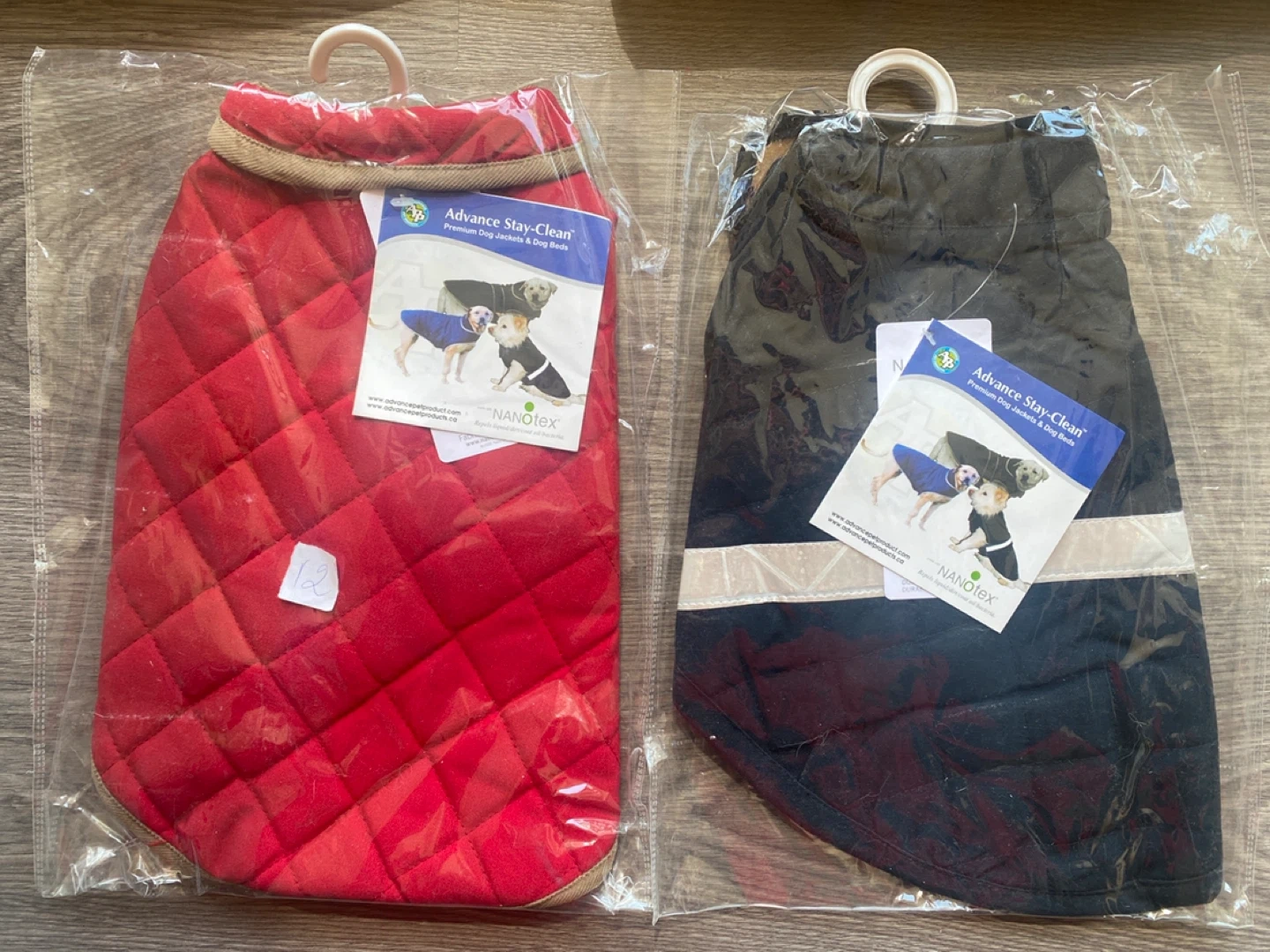 Two dog jackets included, one red and one black. Both feature Advance Stay-Clean technology with Nanotex. Perfect for keeping your dog dry and clean on walks!