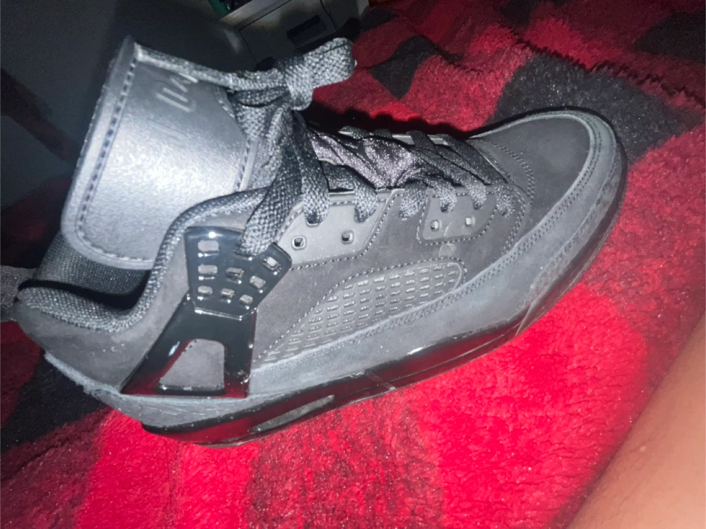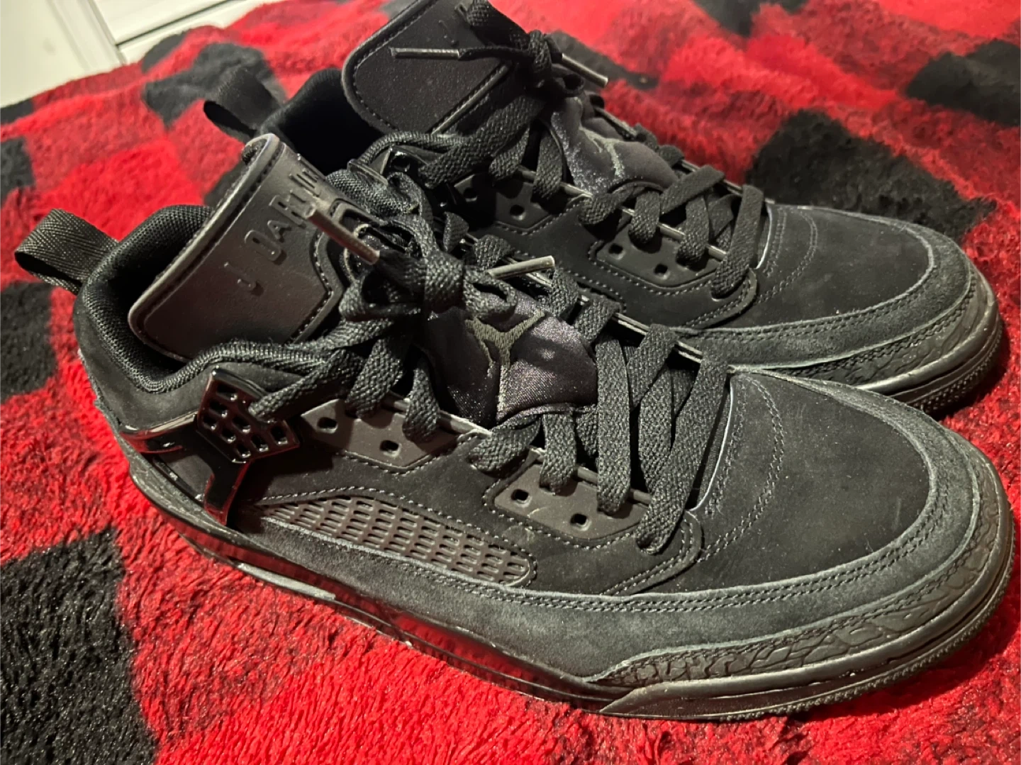 These are Air Jordan 4 sneakers in a black suede finish. They feature a mid-top design with lace-up closure and iconic Jordan branding. Great for everyday wear or athletic activities!