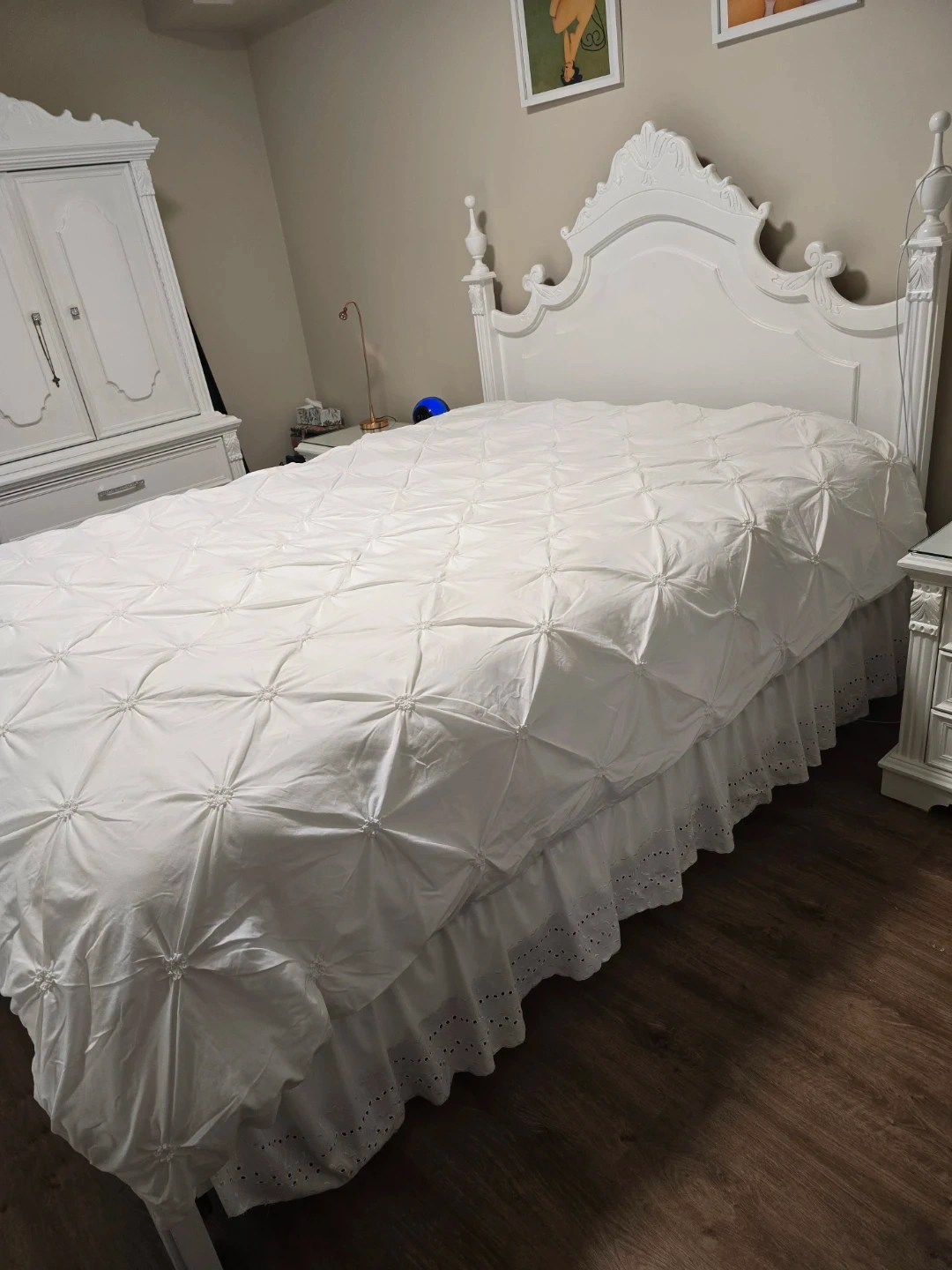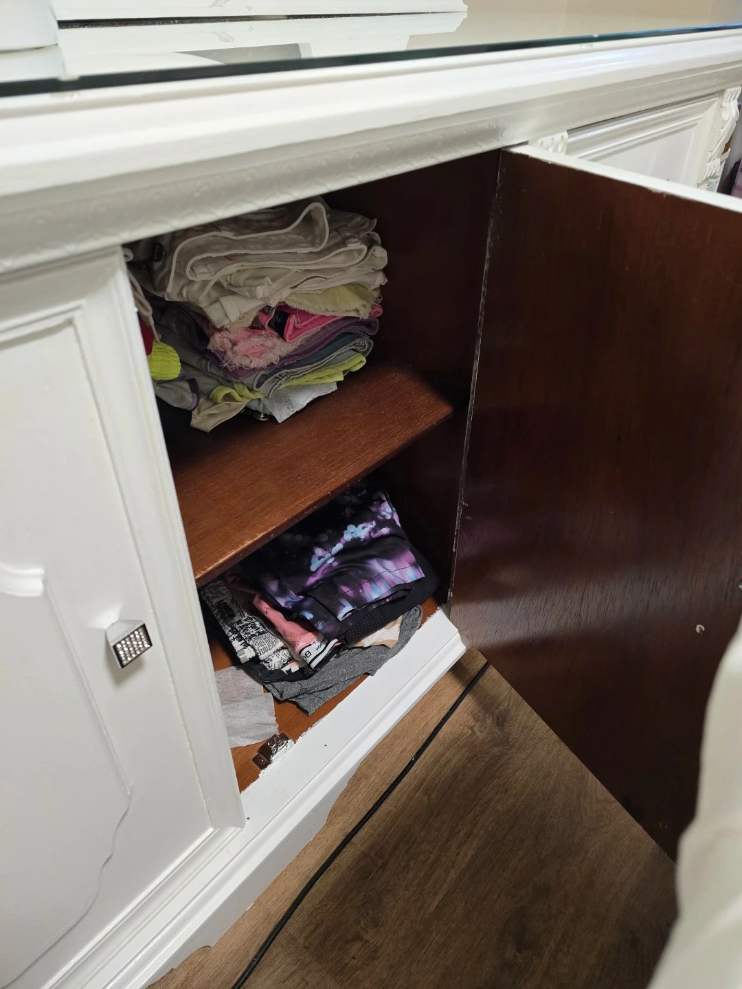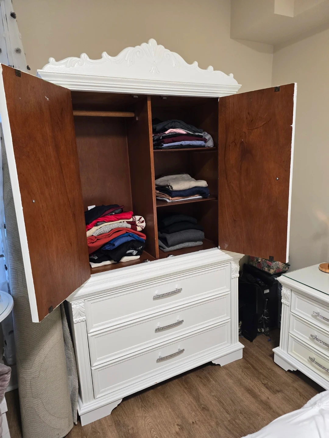 This white dresser features a large oval mirror and a protective glass top. It has multiple drawers and cabinet doors for ample storage. The ornate detailing adds a touch of elegance to any bedroom.