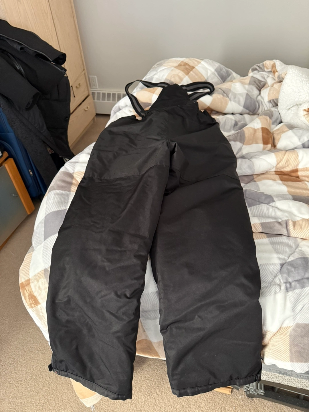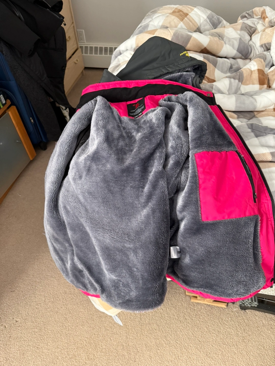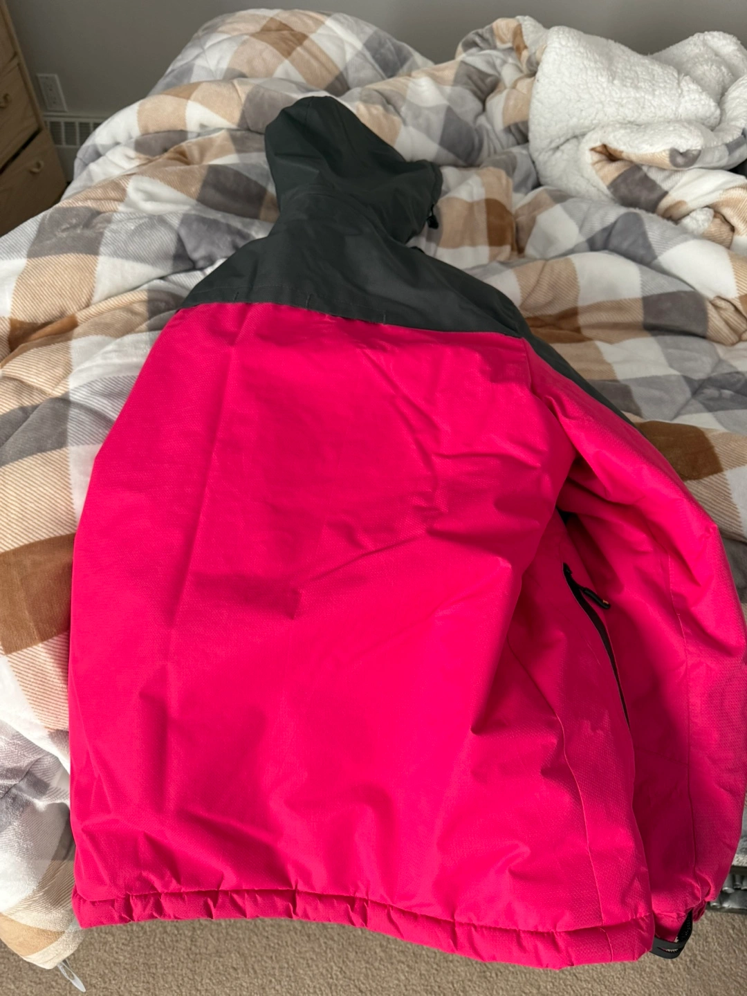 Selling a winter jacket and snow pants set. The jacket is pink and grey, and the pants are black. Great for staying warm during those cold winter days!