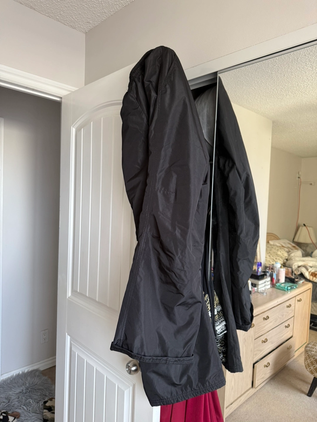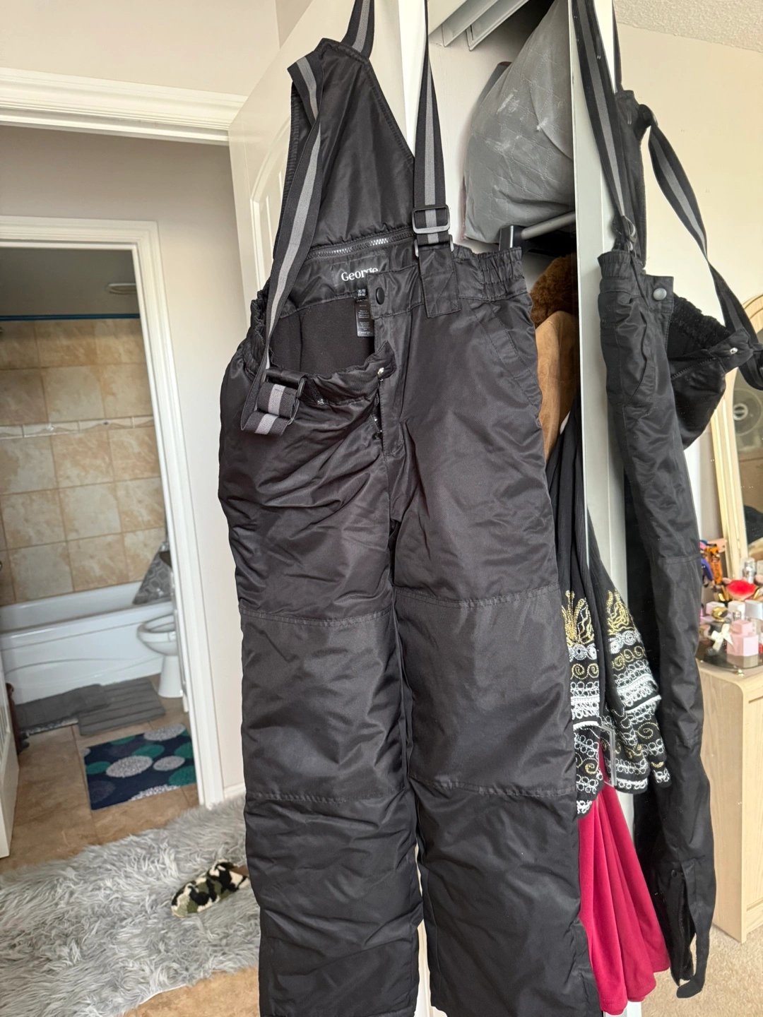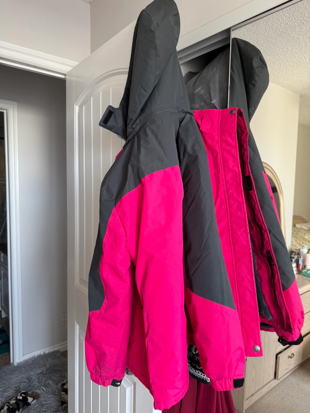 Selling a winter jacket and snow pants set. The jacket is pink and grey, and the pants are black. Great for staying warm during those cold winter days!