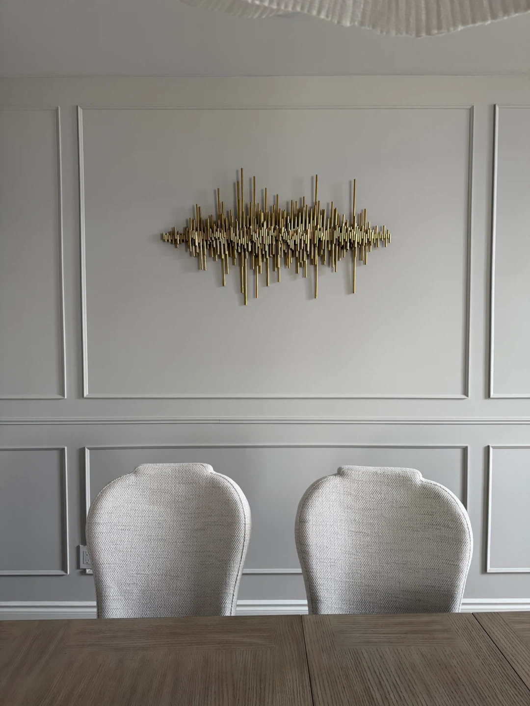 Unique wall art piece designed to resemble a soundwave. It's crafted from metal with a gold finish. This statement piece adds a modern touch to any room!