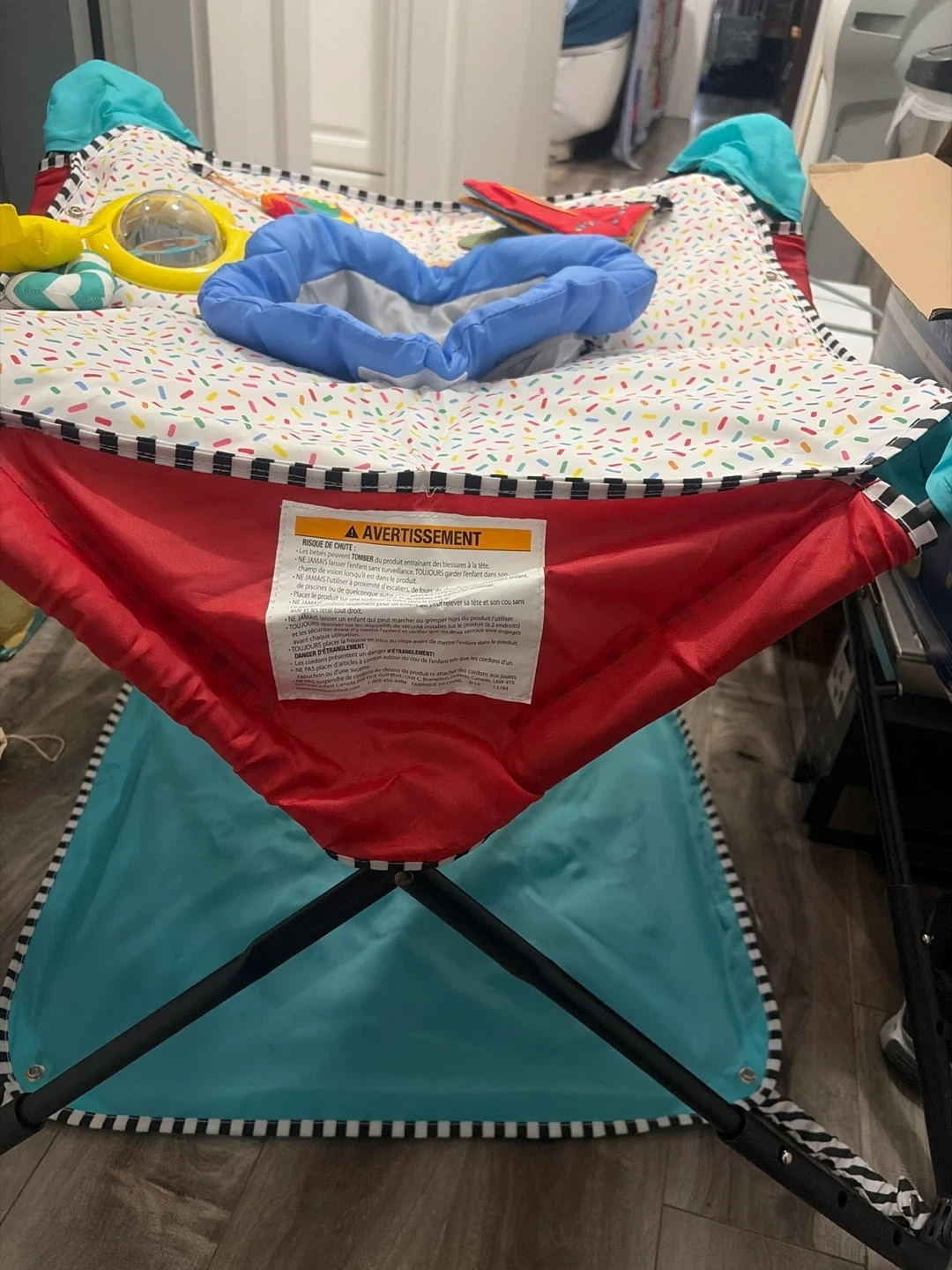 This baby bouncer seat features a colourful sprinkle pattern and a blue heart-shaped bolster. It has a sturdy frame with black legs and a teal fabric base. It includes a yellow teether toy attachment.