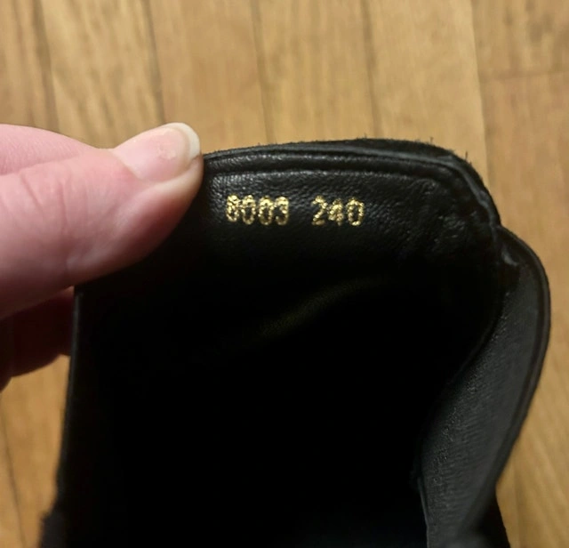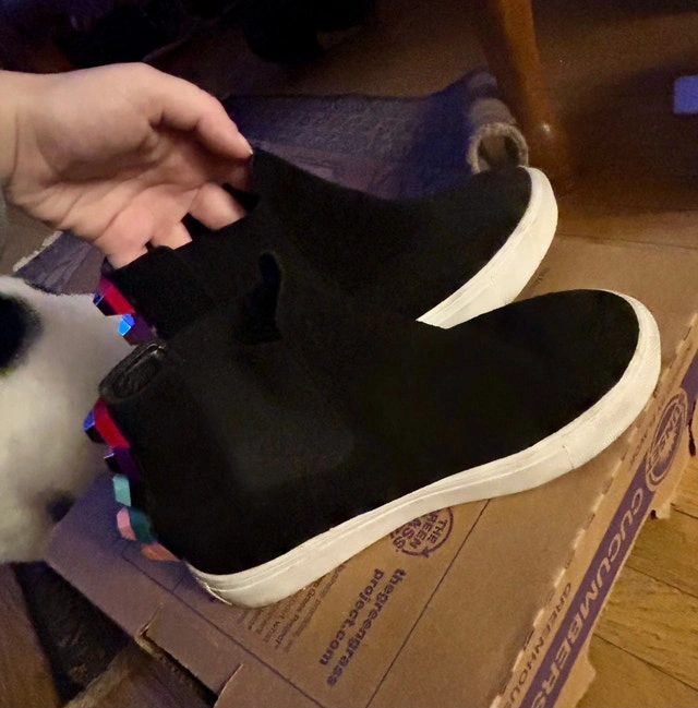 • White rubber soles, black suede exterior with multicoloured studded design.