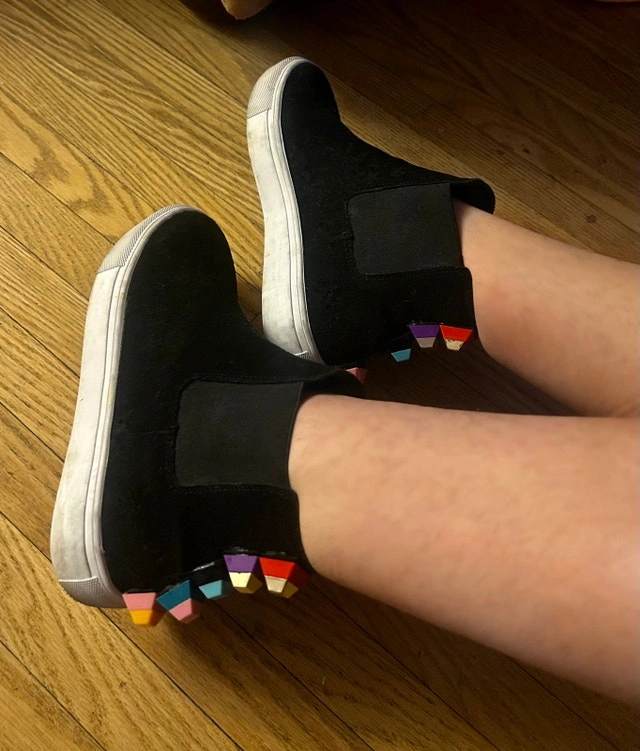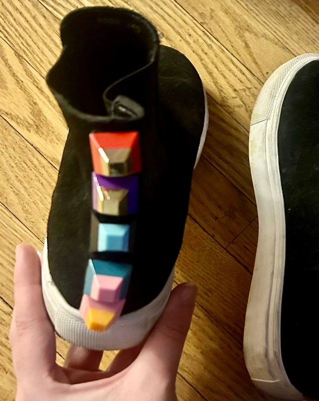 • White rubber soles, black suede exterior with multicoloured studded design.