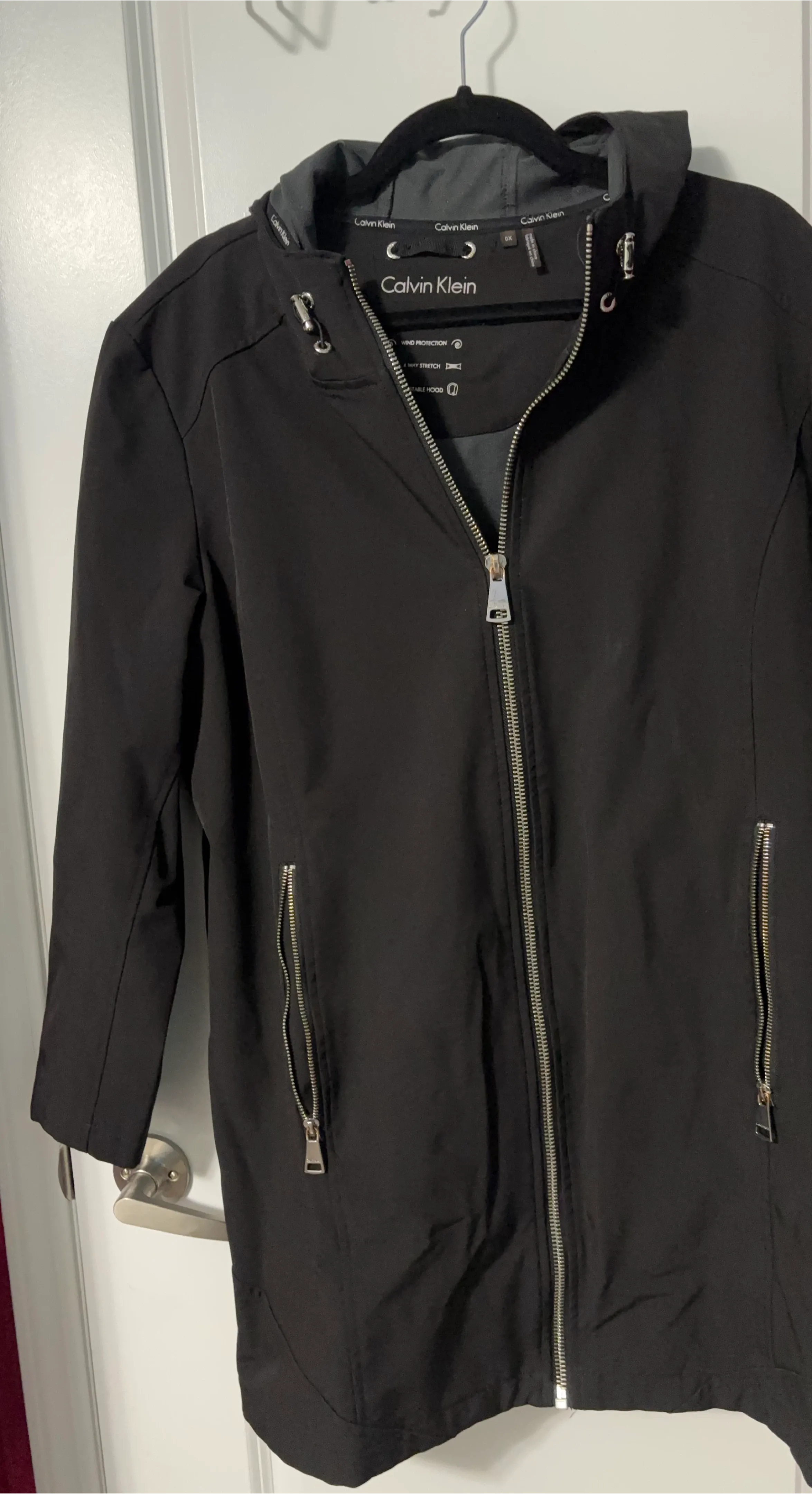 Calvin Klein jacket in black, size 0X. It's wind-protective and features 4-way stretch fabric. The hood is adjustable. Perfect for everyday wear!