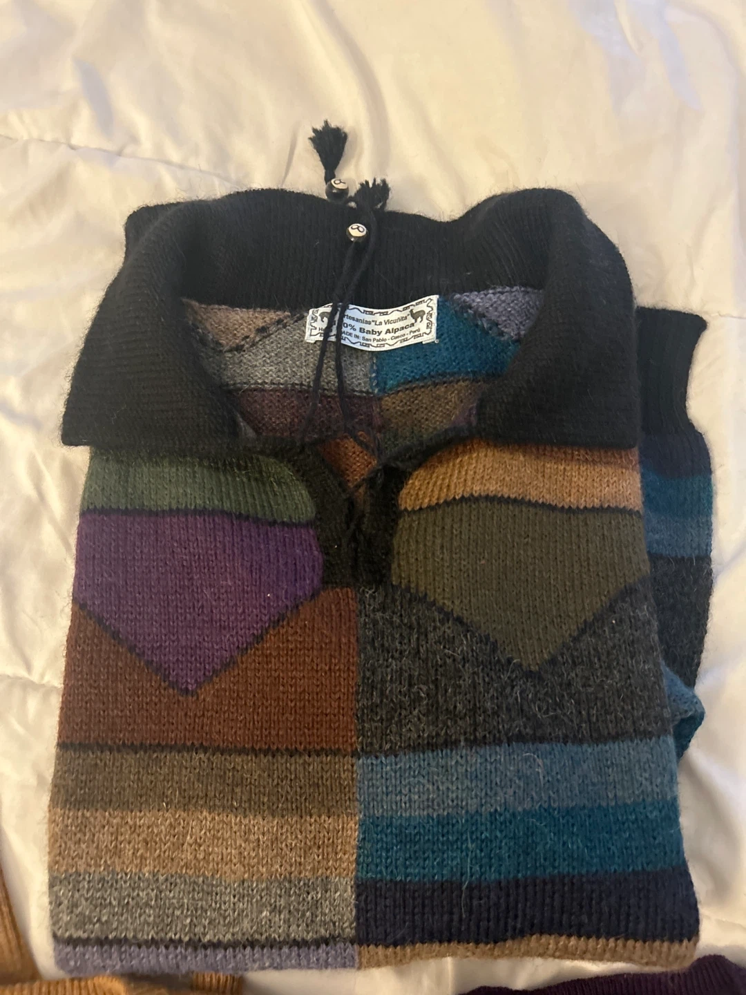 This lot includes three V-neck sweaters. One is a brown V-neck from Joe Fresh. Another is a purple V-neck from Distinction. The third sweater is a colourful knit with a black collar, made from 90% Baby Alpaca. They're great for layering during cooler weather!