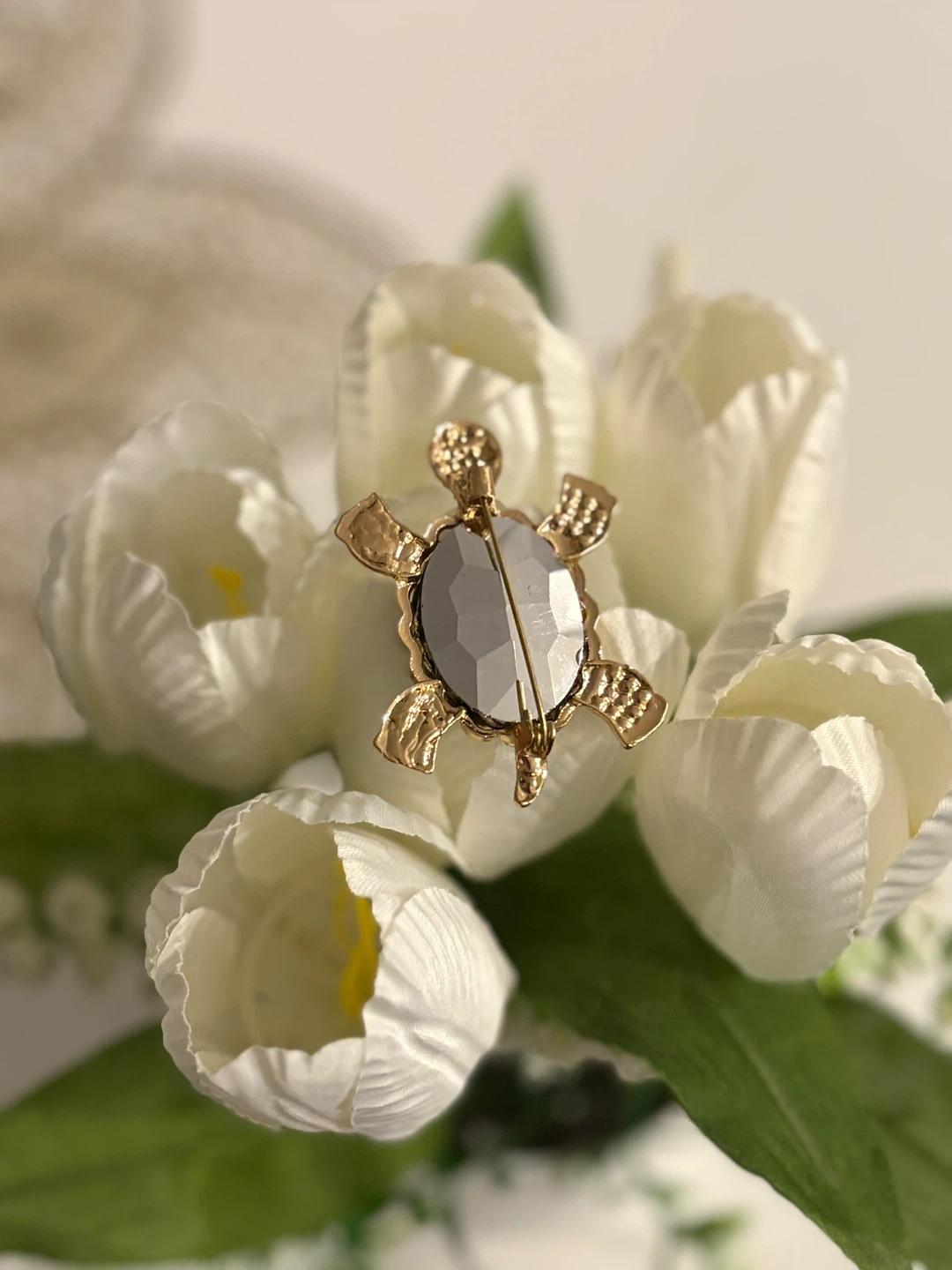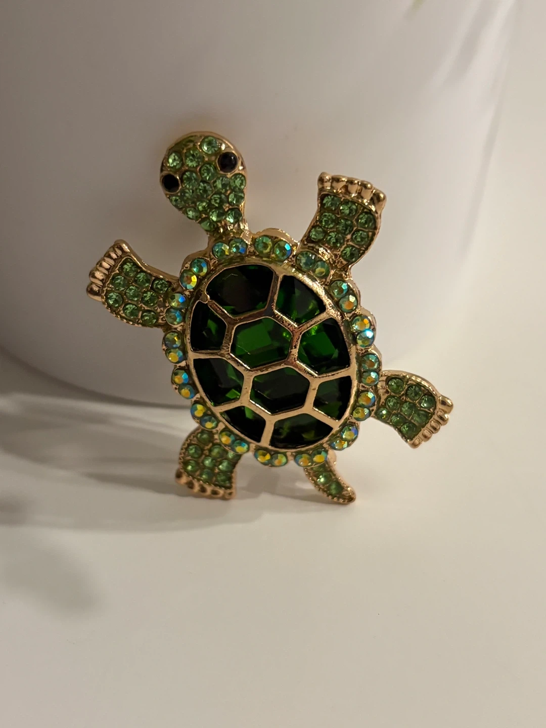A charming turtle brooch with green rhinestones and a faceted green gem shell. It's gold-toned with an intricate design. This pretty pin is perfect for adding a bit of sparkle to your outfit!