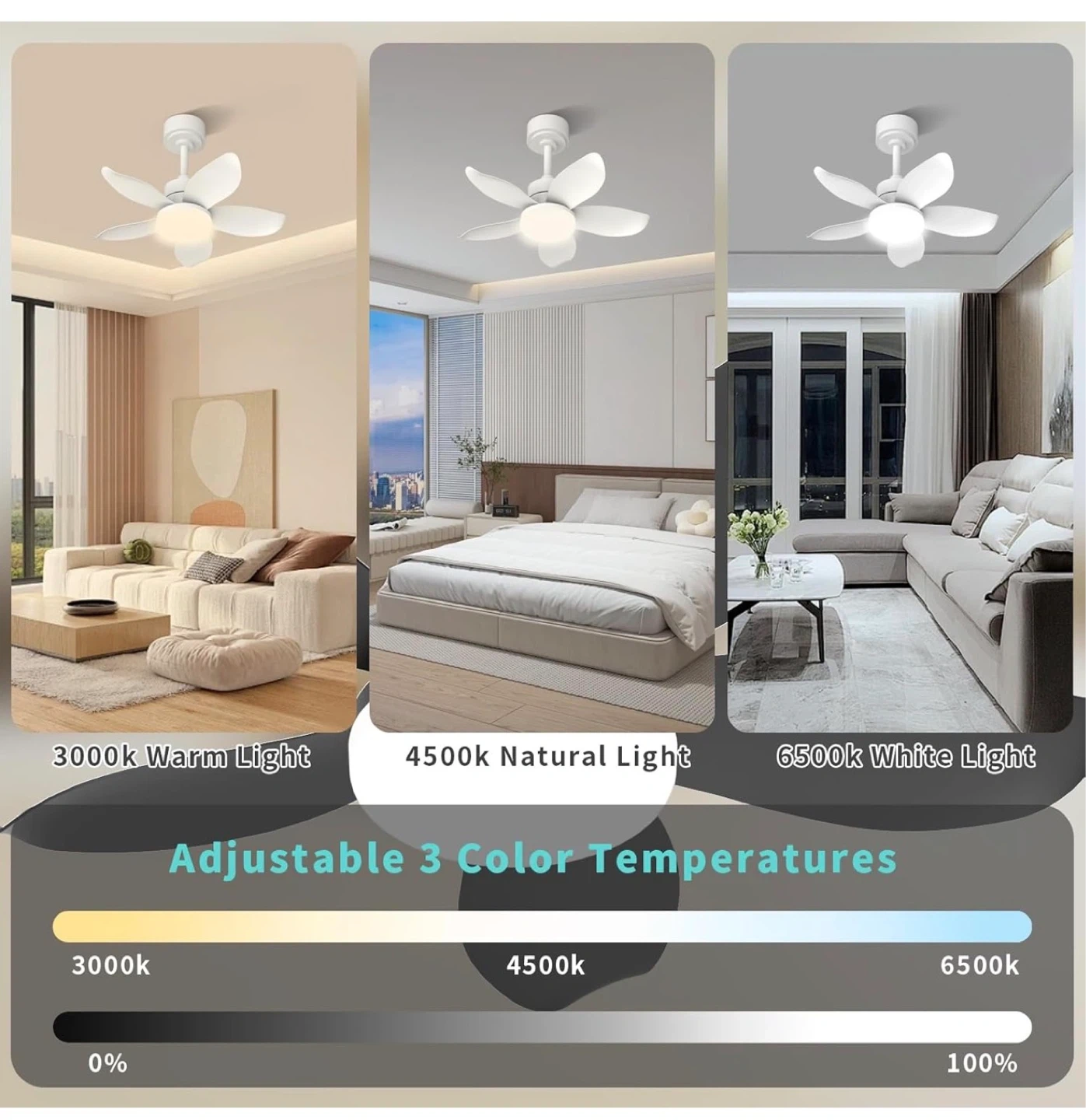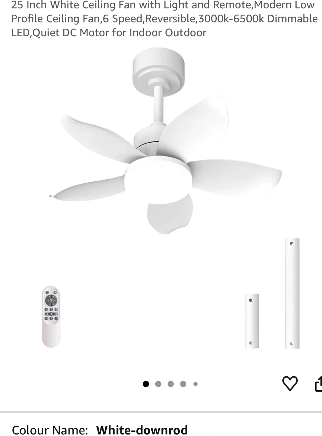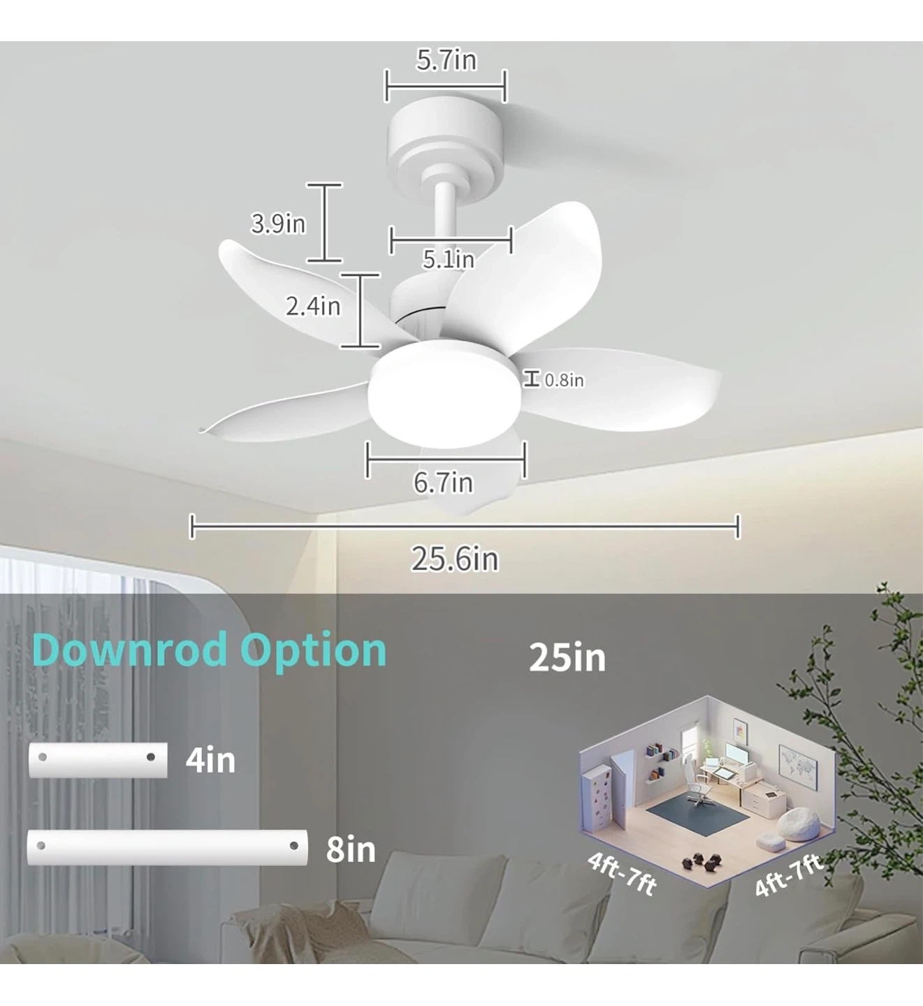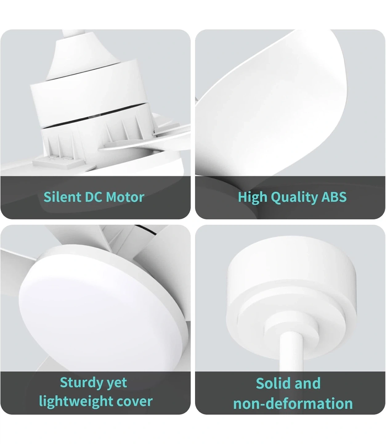 This is a 25-inch white ceiling fan with a reversible, dimmable LED light. It features a quiet DC motor and offers 6 speed options with adjustable color temperatures (3000K, 4500K, 6500K). The fan is constructed with high-quality ABS and a sturdy, lightweight cover.