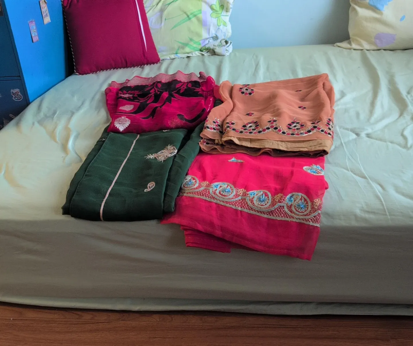This bundle includes four beautifully designed Indian saris in vibrant colours. Features include intricate embroidery and detailed borders on each piece. Suitable for special occasions or everyday wear.
