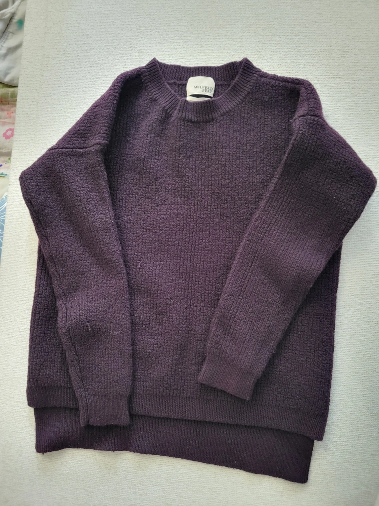 Women's dark purple knit sweater. Long sleeves, relaxed fit. Made in Italy. Slightly longer in the back.